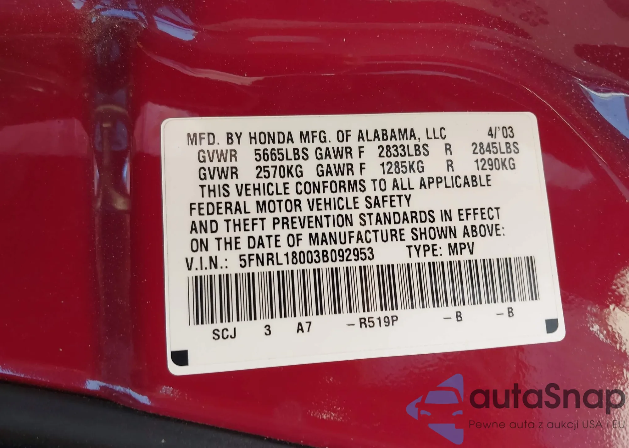 VIN: 5FNRL18003B092953