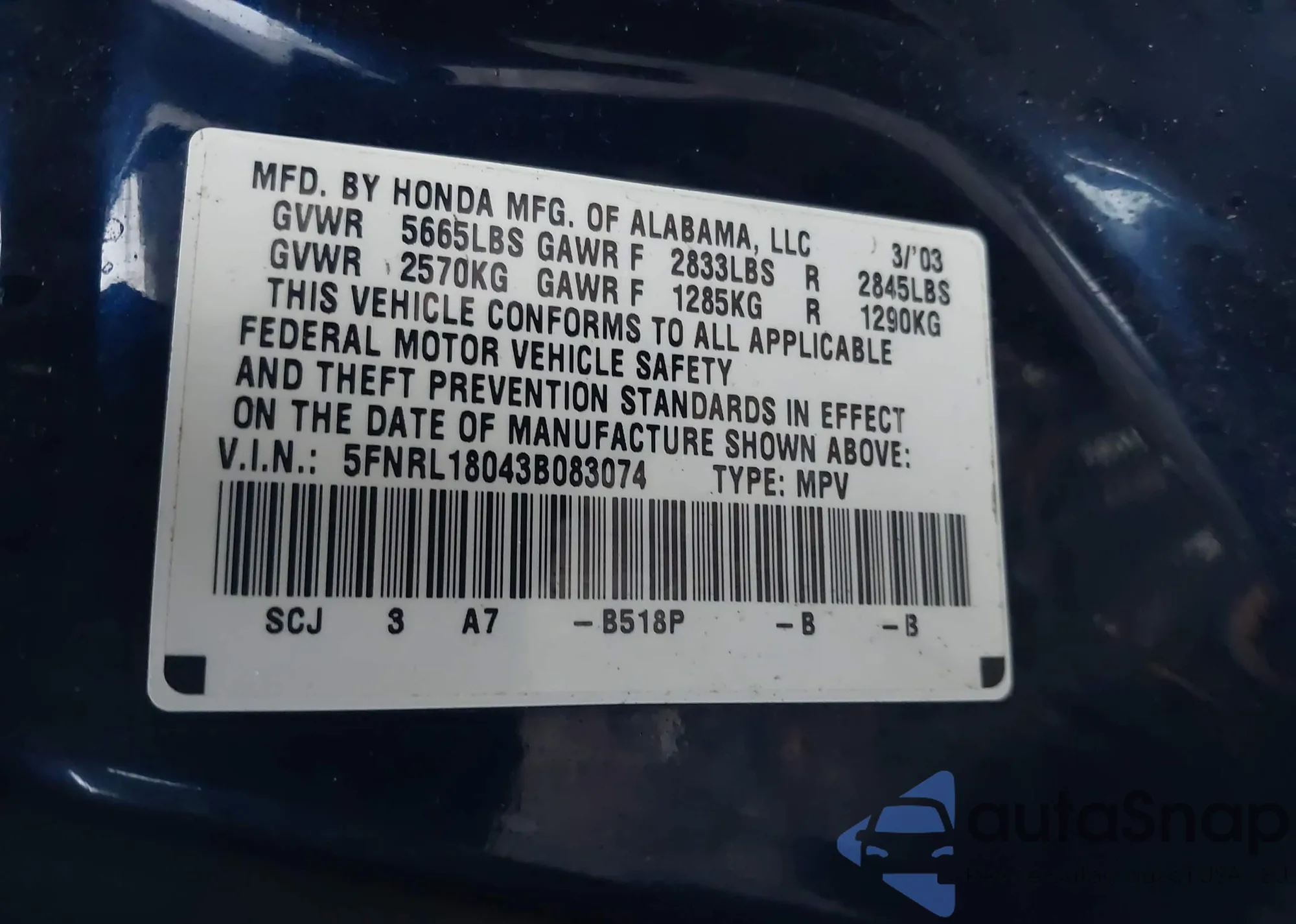 VIN: 5FNRL18043B083074