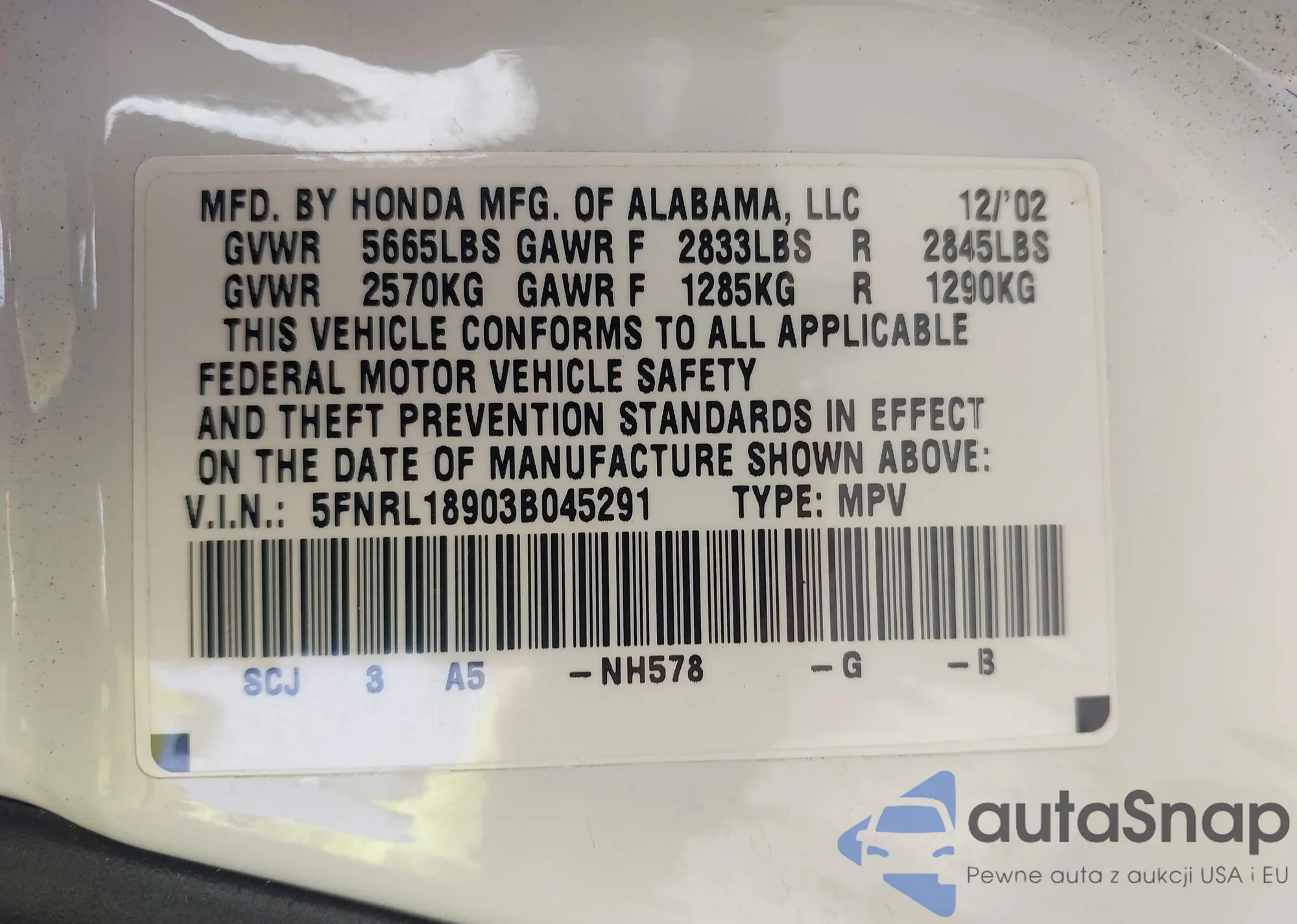 The car Honda Odyssey 2003 (VIN 5FNRL18903B045291) is sold by an unverified seller. We recommend checking the Carfax report and confirming registration possibilities before purchase.
