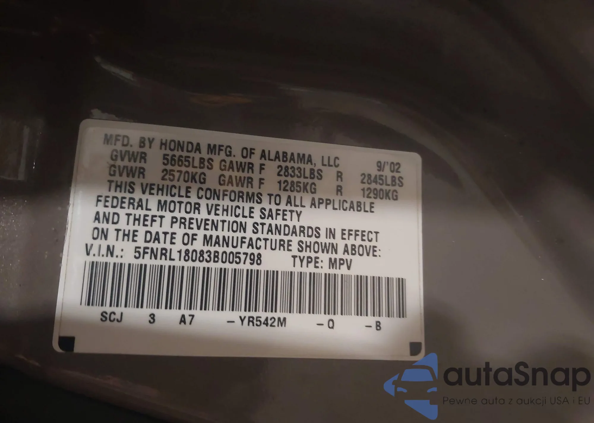 VIN: 5FNRL18083B005798