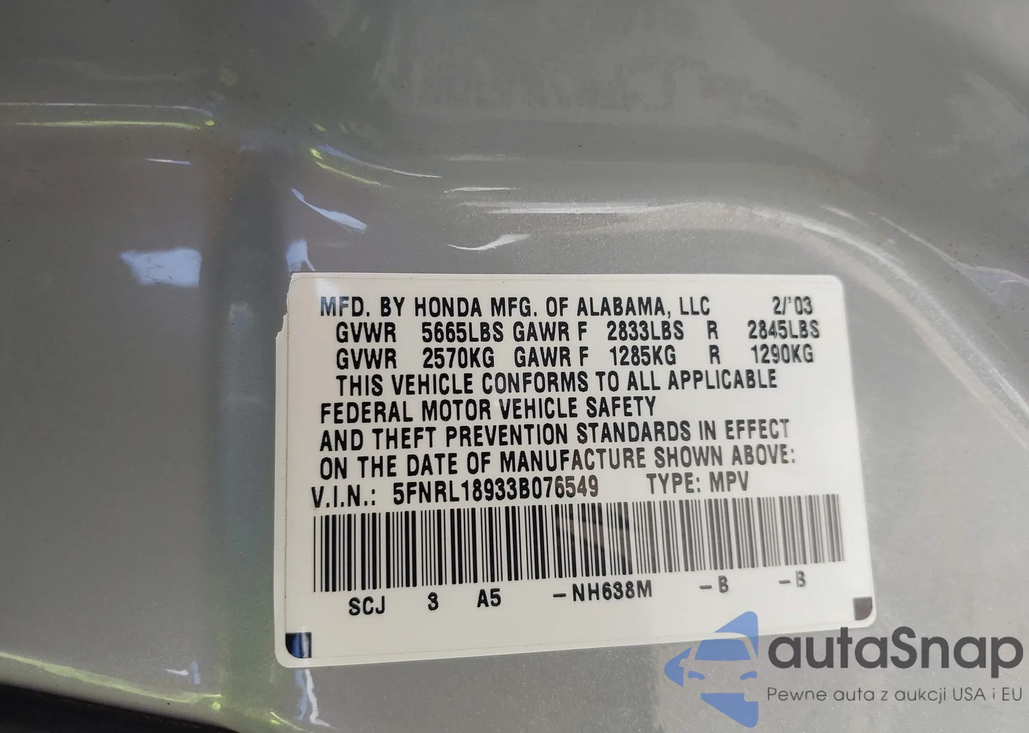 • VIN: 5FNRL18933B076549