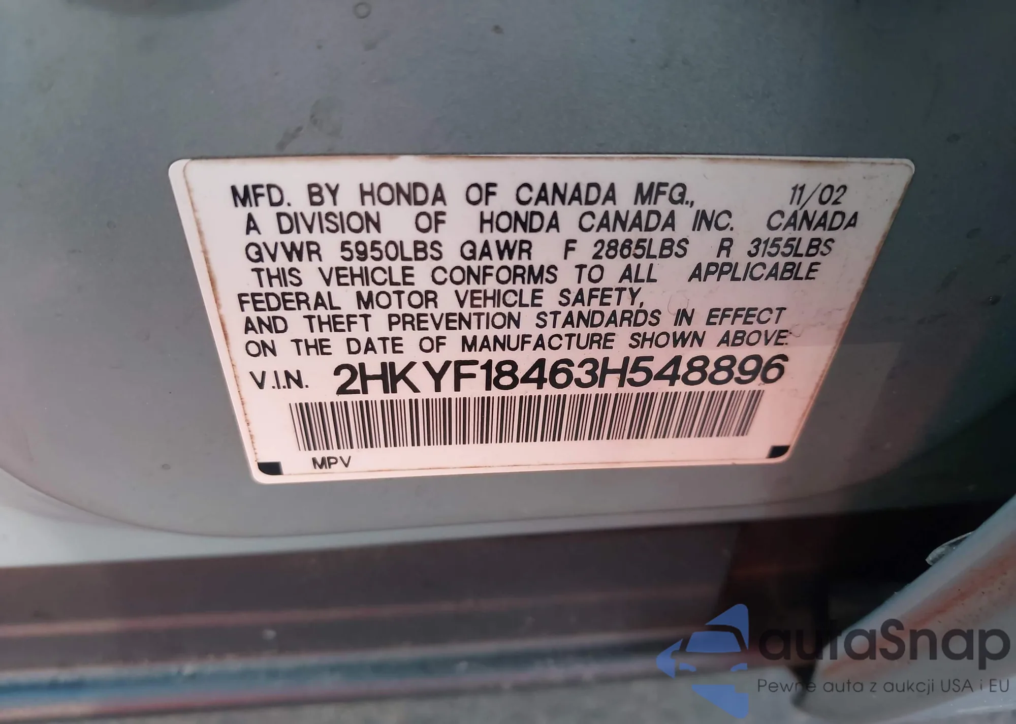 VIN: 2HKYF18463H548896