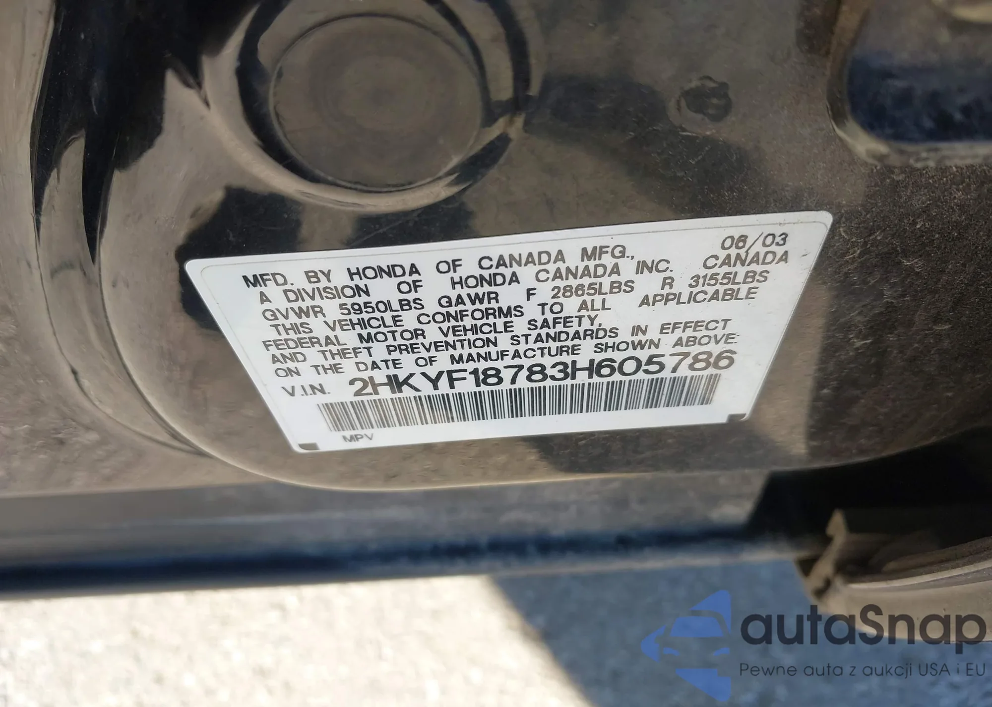 VIN: 2HKYF18783H605786