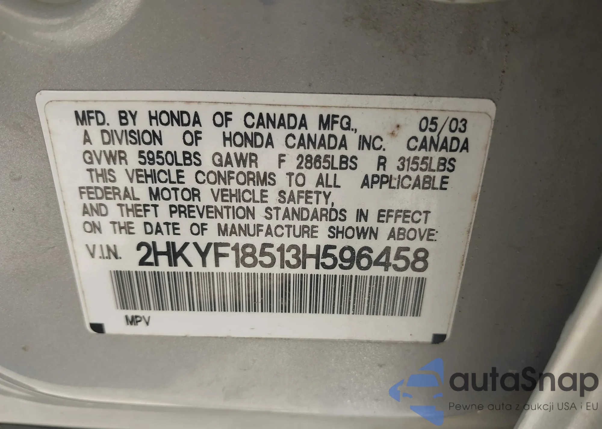 • VIN: 2HKYF18513H596458