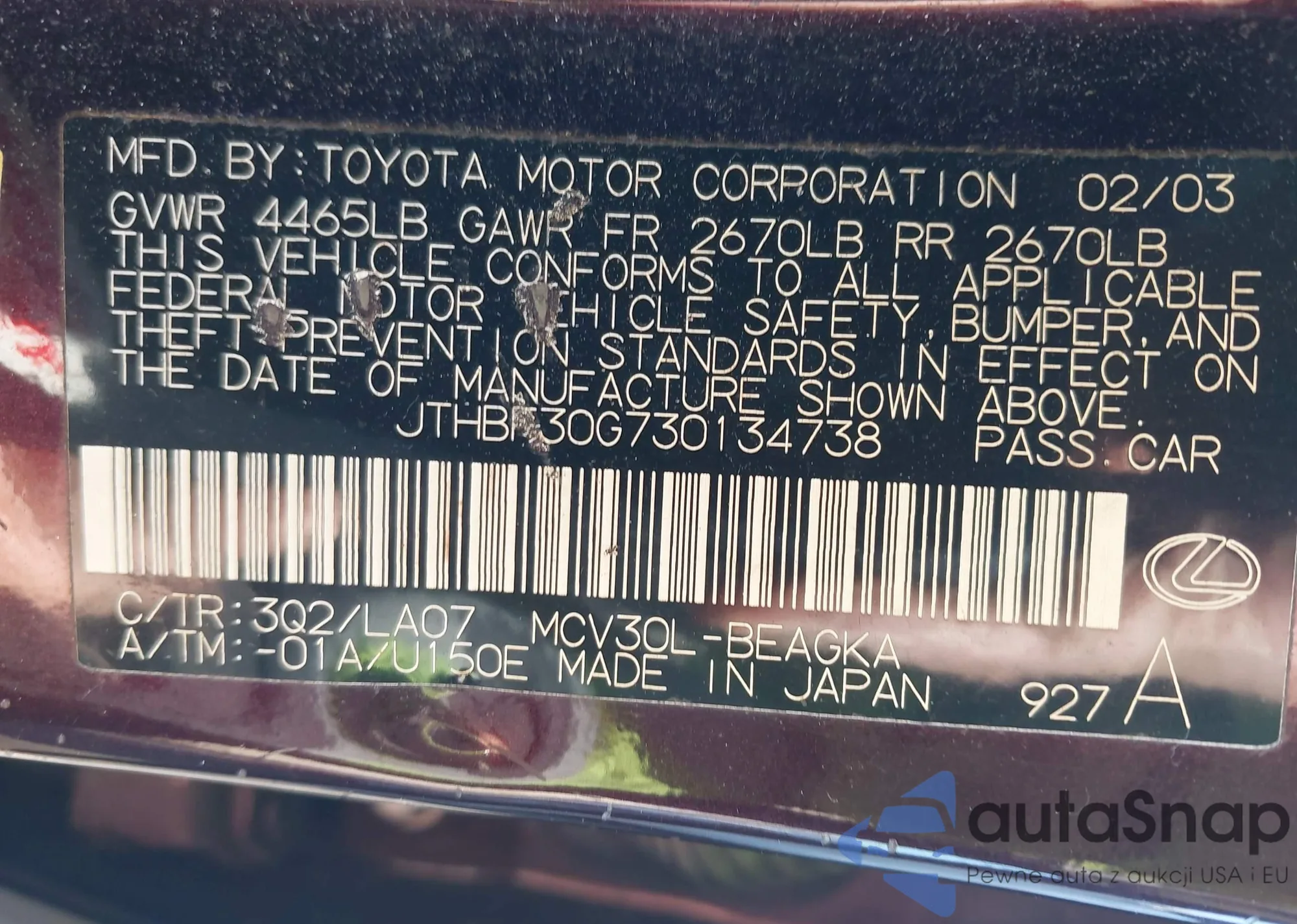 VIN: JTHBF30G730134738