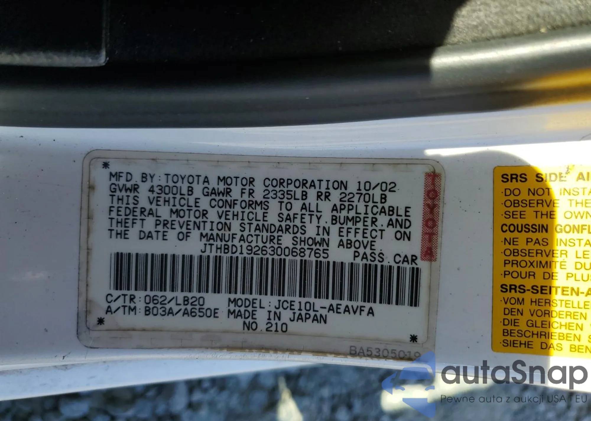 VIN: JTHBD192630068765