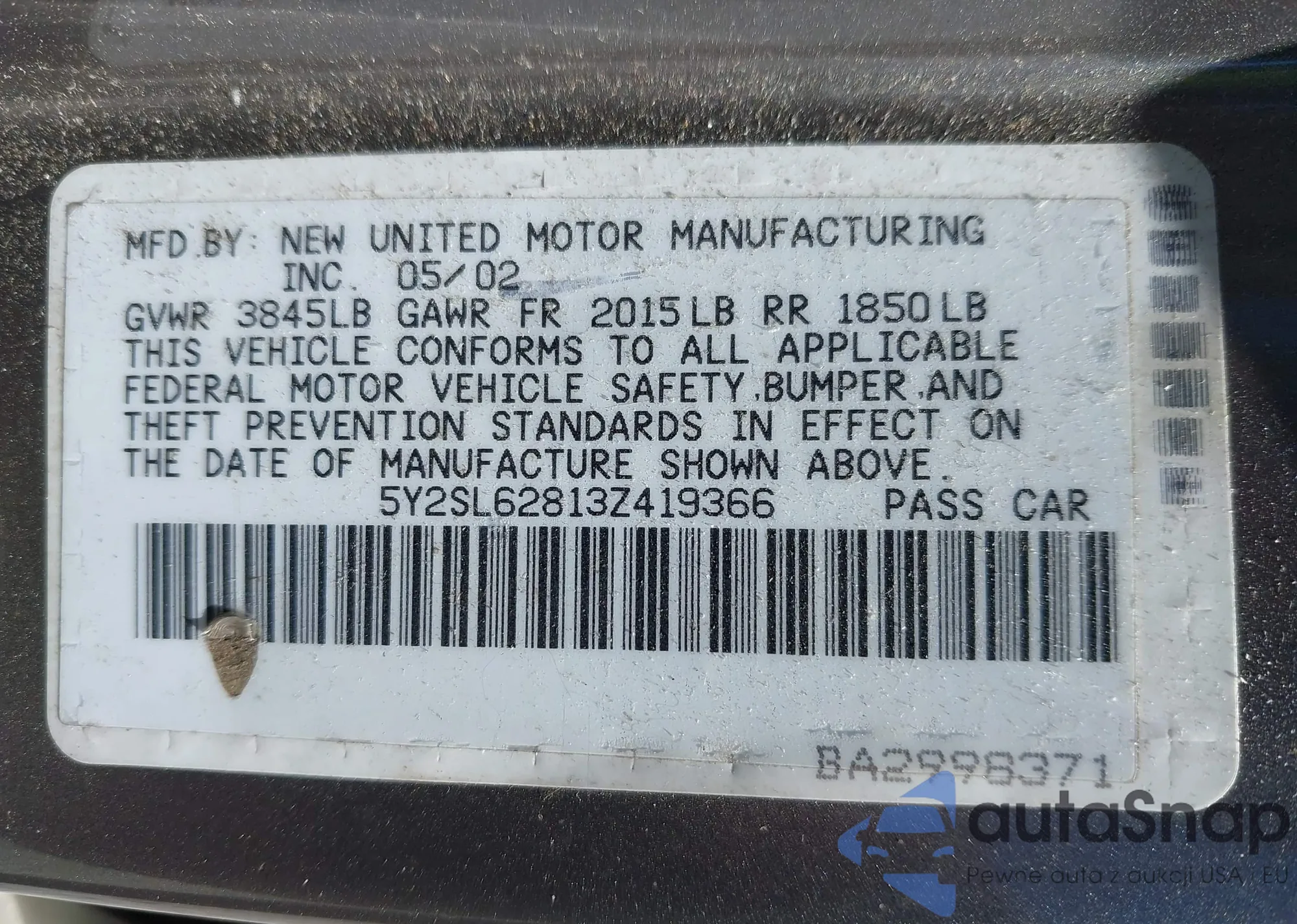 VIN: 5Y2SL62813Z419366
