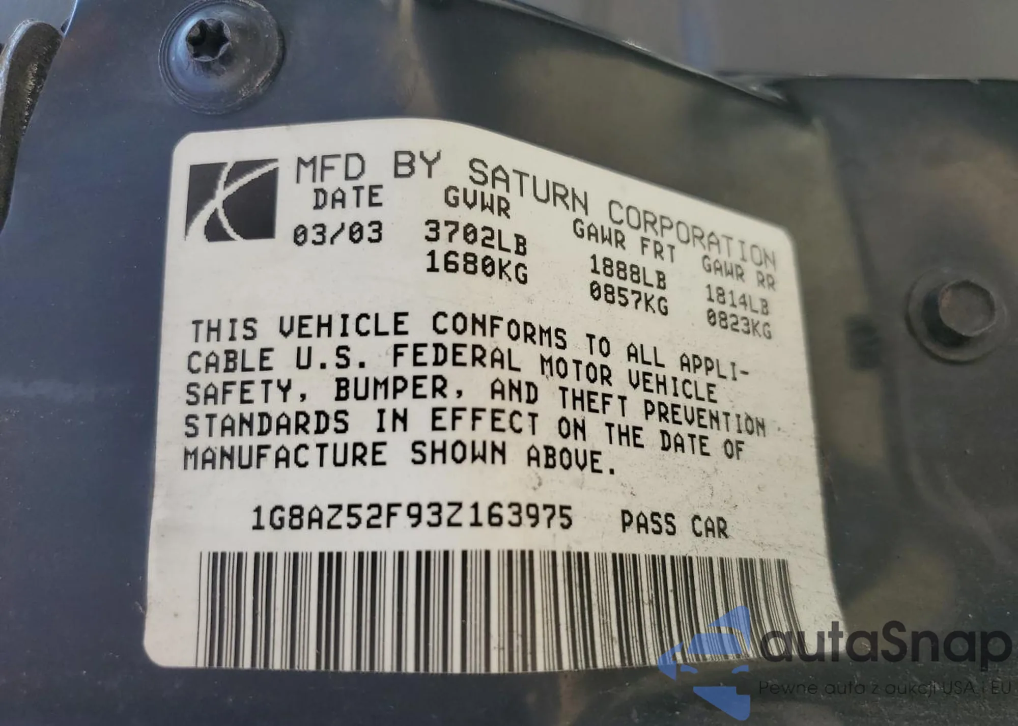 • VIN: 1G8AZ52F93Z163975