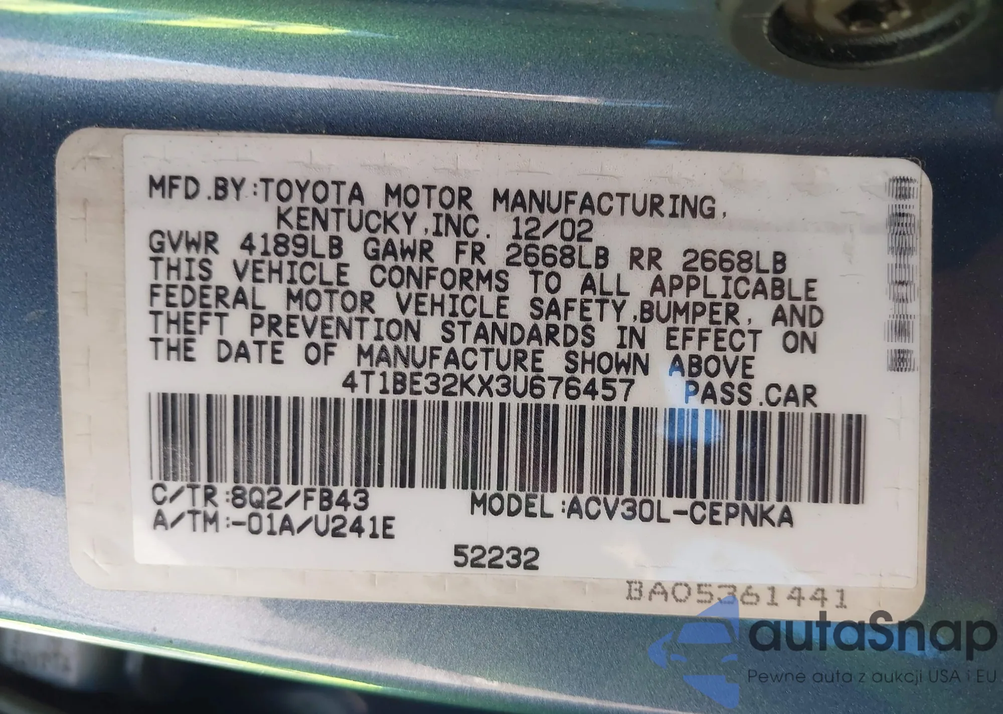 • VIN: 4T1BE32KX3U676457