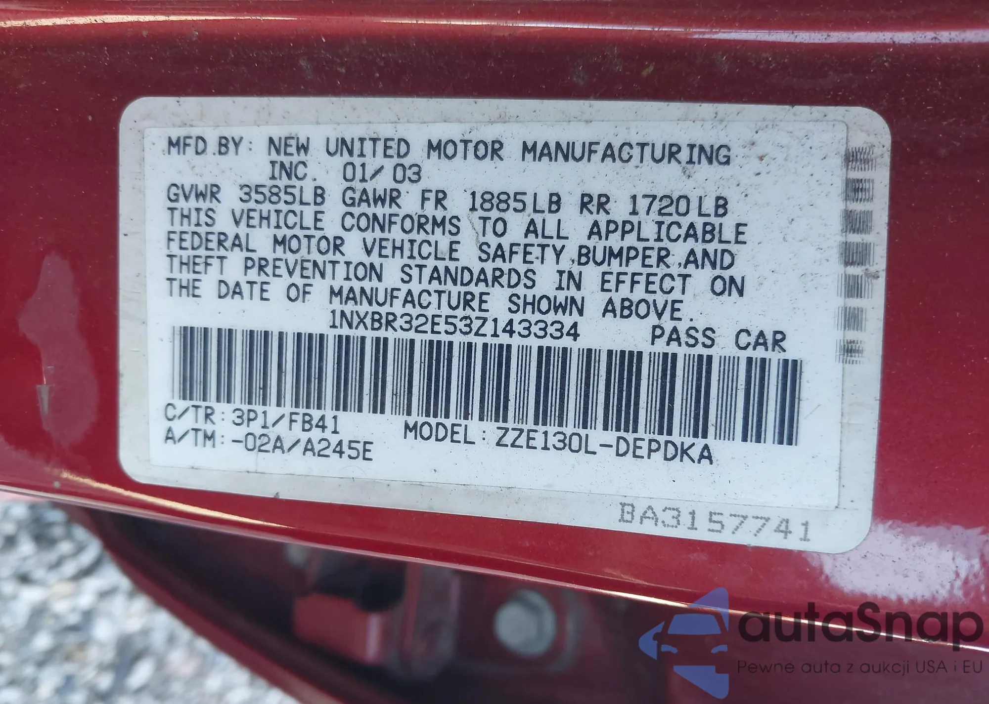The car Toyota Corolla 2003 (VIN 1NXBR32E53Z143334) has not been auctioned before. The documents are clean, and the mileage matches or is below the market average. Sold by an insurance company – we recommend purchase. Delivery to the port will take approx. 6–8 weeks.