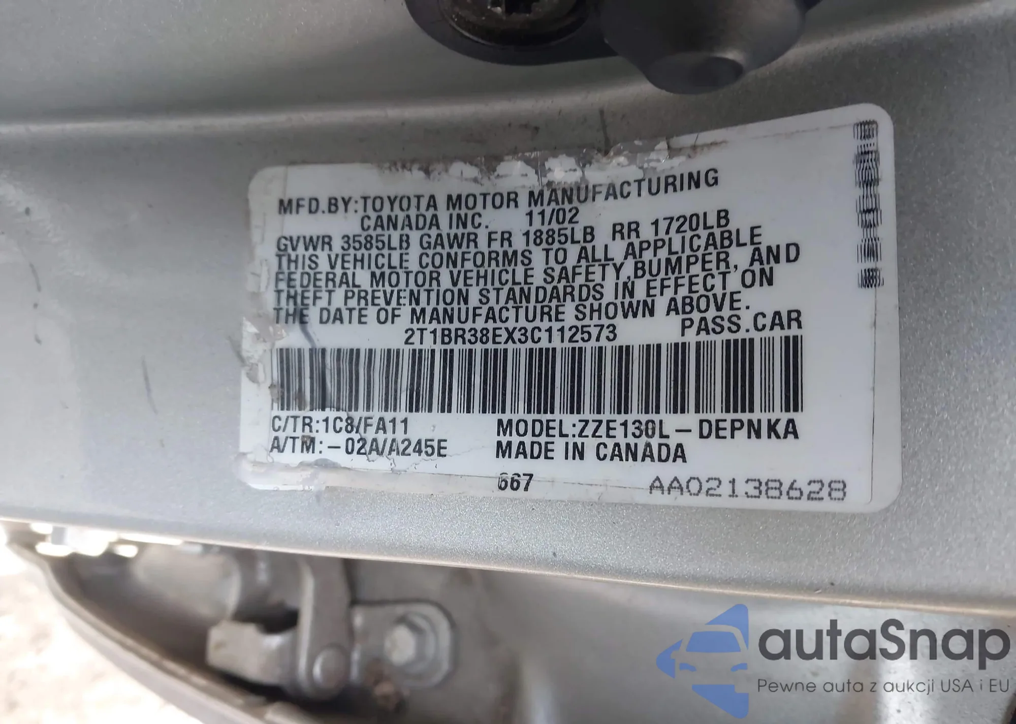 • VIN: 2T1BR38EX3C112573
