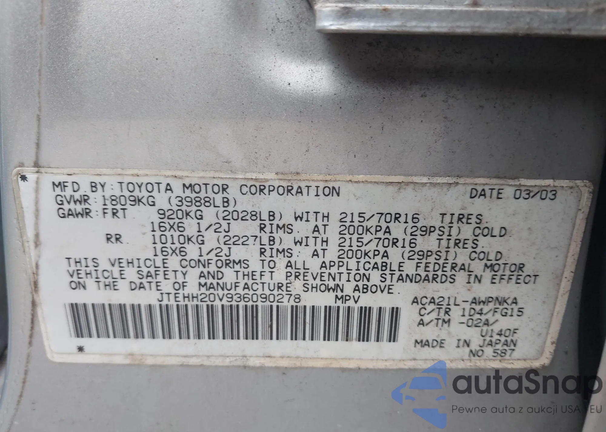 The car Toyota RAV 4 2003 (VIN JTEHH20V936090278) is sold by an unverified seller. We recommend checking the Carfax report and confirming registration possibilities before purchase.