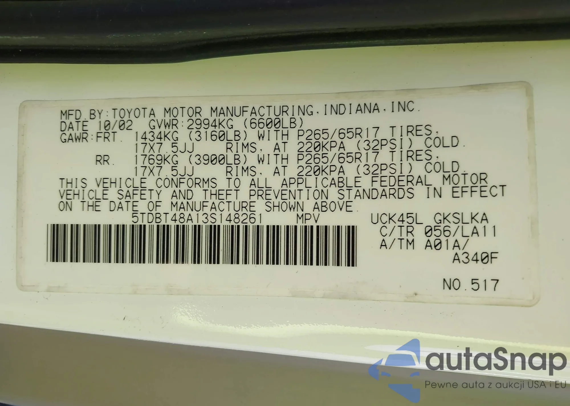 The car Toyota Sequoia 2003 (VIN 5TDBT48A13S148261) is sold by an unverified seller. We recommend checking the Carfax report and confirming registration possibilities before purchase.