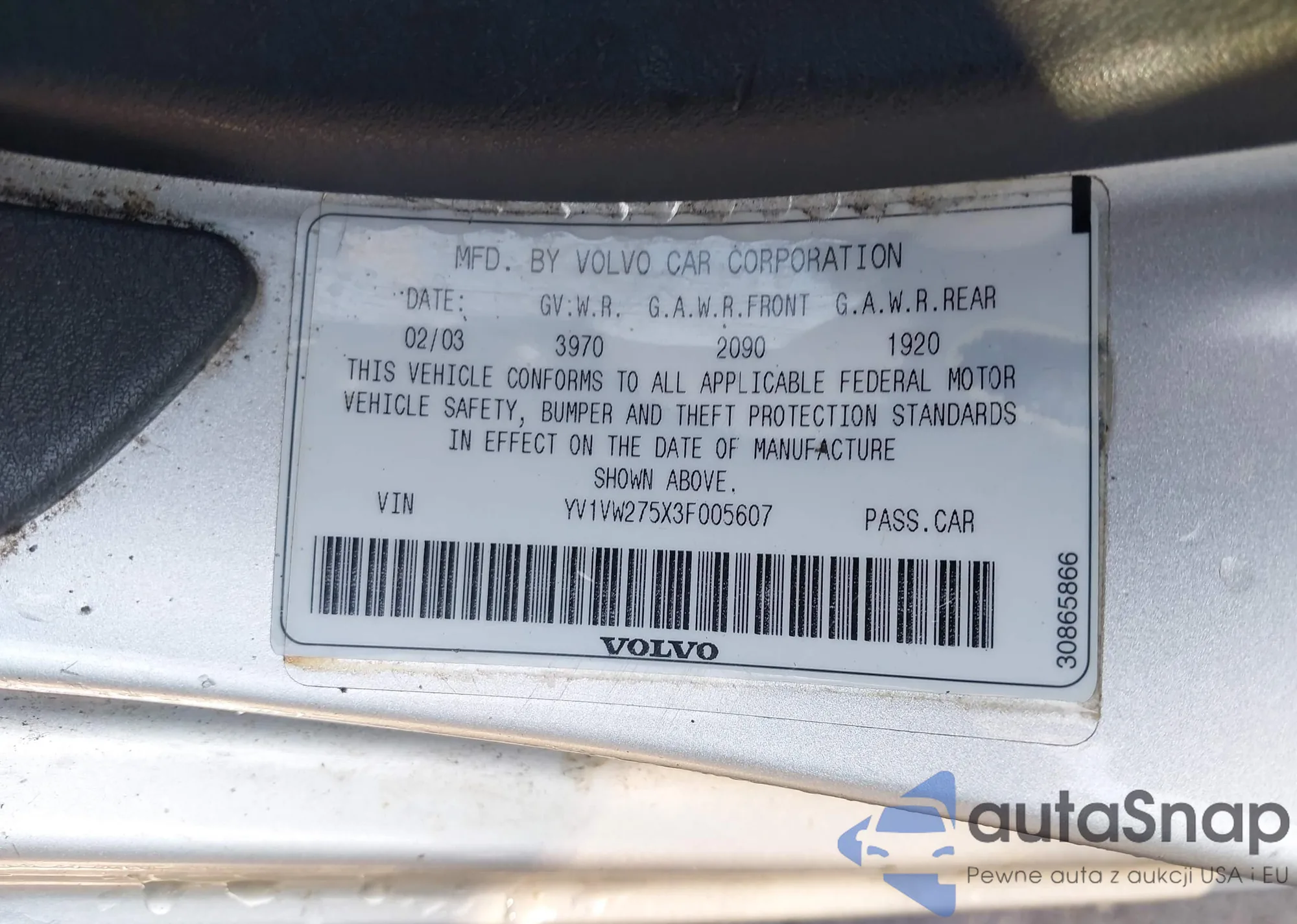 VIN: YV1VW275X3F005607
