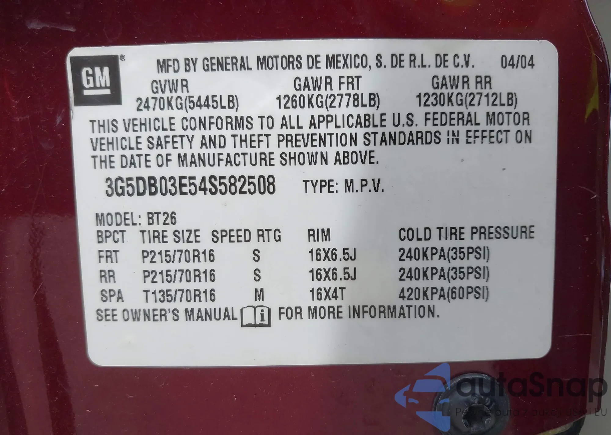 VIN: 3G5DB03E54S582508