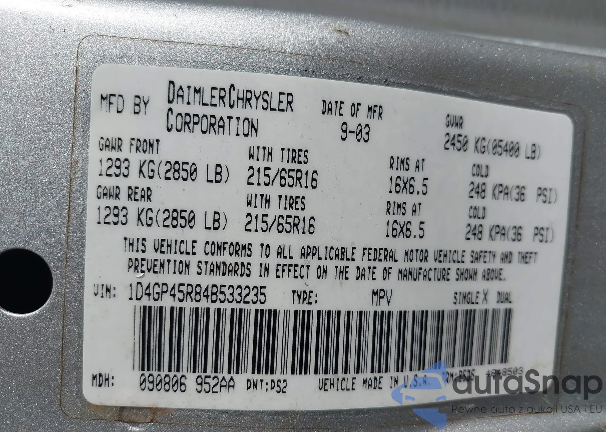 The car Dodge Caravan 2004 (VIN 1D4GP45R84B533235) has documents that prevent registration. Export and registration may be difficult. Contact AutaSnap experts to find alternatives.