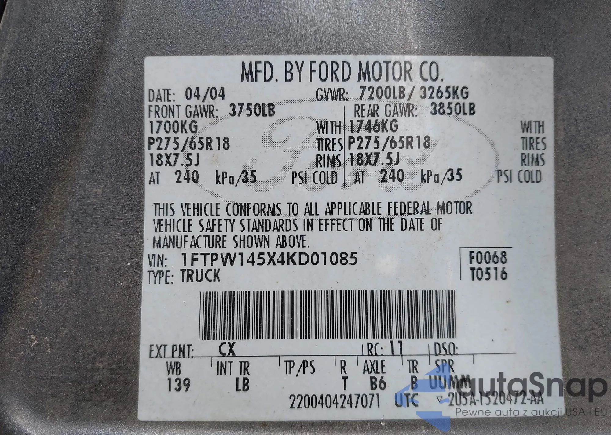 VIN: 1FTPW145X4KD01085