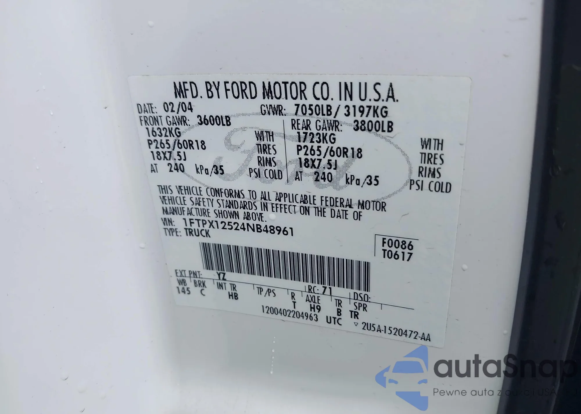 VIN: 1FTPX12524NB48961