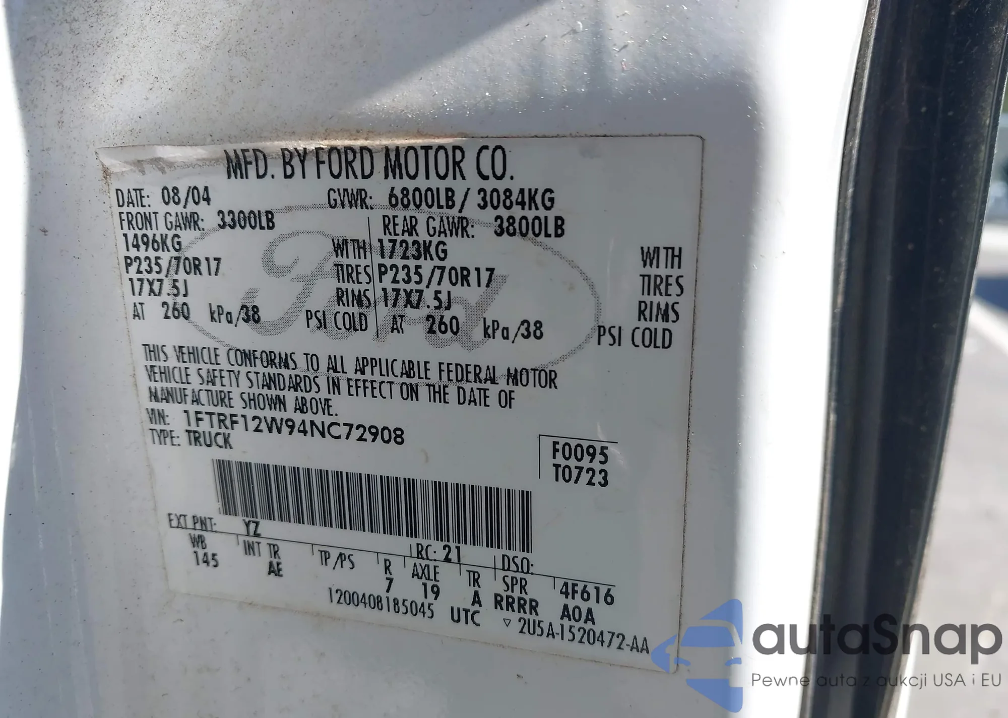 The car Ford F-150 2004 (VIN 1FTRF12W94NC72908) has not been auctioned before. The documents are clean, and the mileage matches or is below the market average. Sold by an insurance company – we recommend purchase. Delivery to the port will take approx. 6–8 weeks.