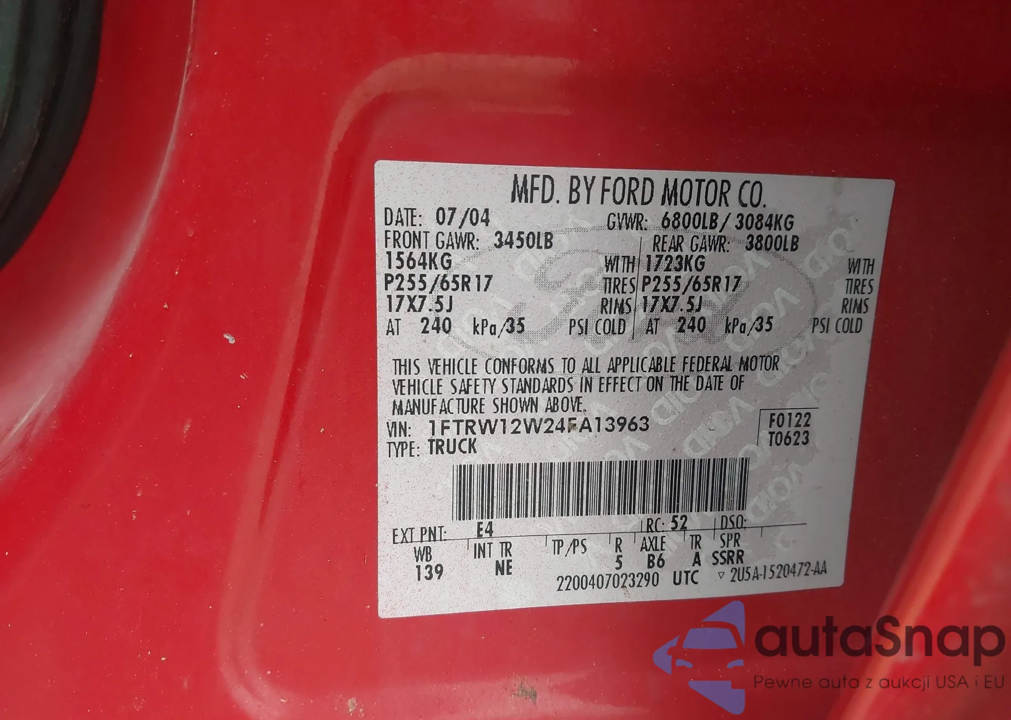 The car Ford F-150 2004 (VIN 1FTRW12W24FA13963) has not been auctioned before. The documents are clean, and the mileage matches or is below the market average. Sold by an insurance company – we recommend purchase. Delivery to the port will take approx. 6–8 weeks.