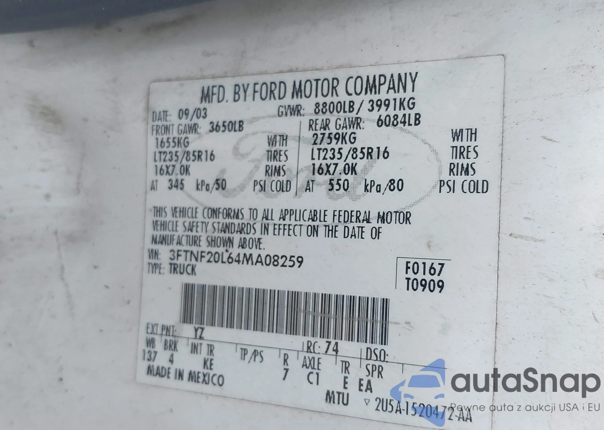 The car Ford F250 2004 (VIN 3FTNF20L64MA08259) has documents that prevent registration. Export and registration may be difficult. Contact AutaSnap experts to find alternatives.