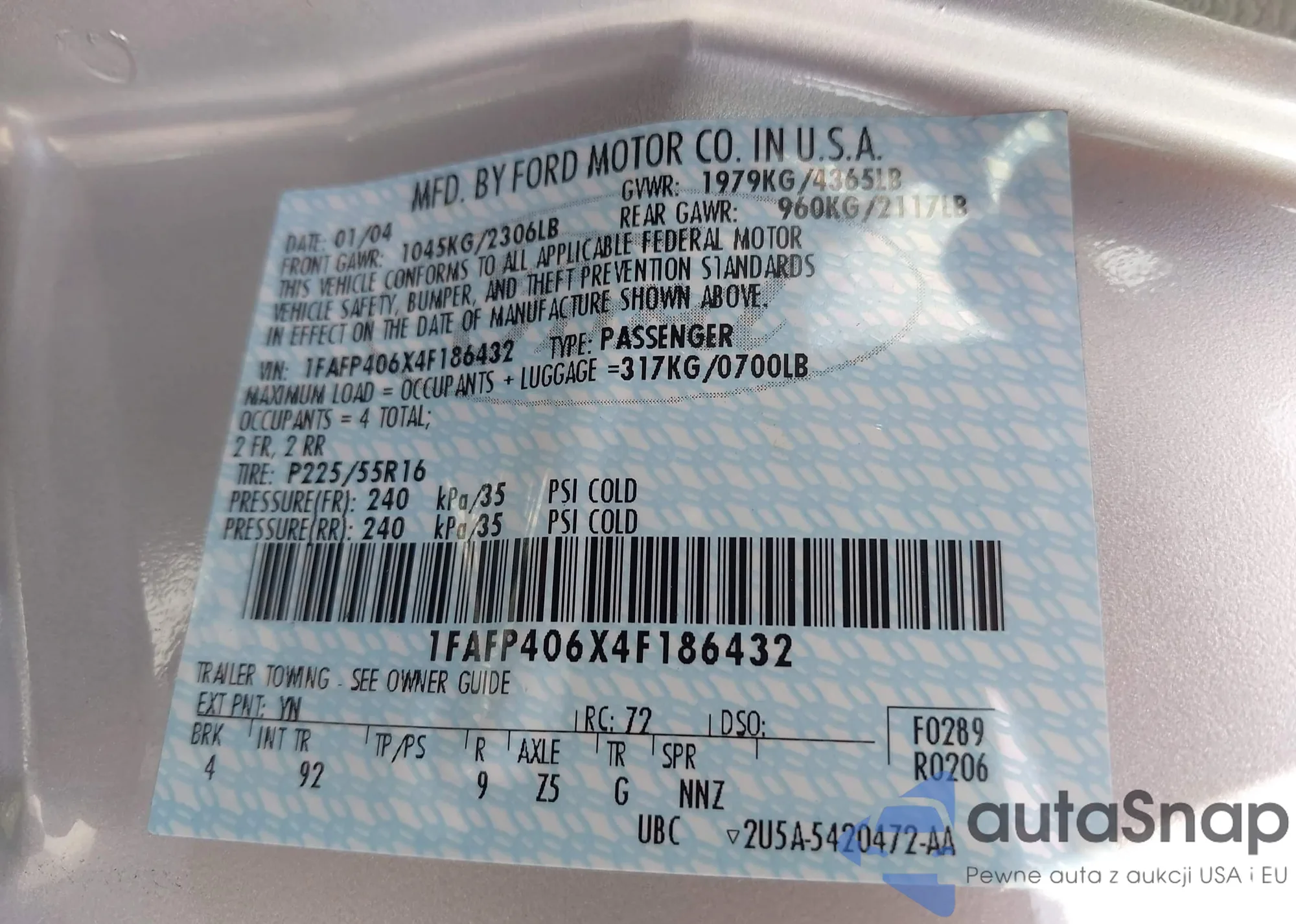 • VIN: 1FAFP406X4F186432