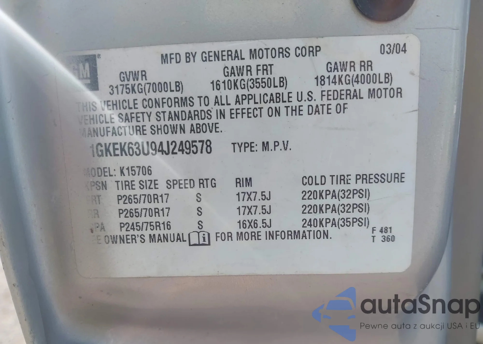 VIN: 1GKEK63U94J249578