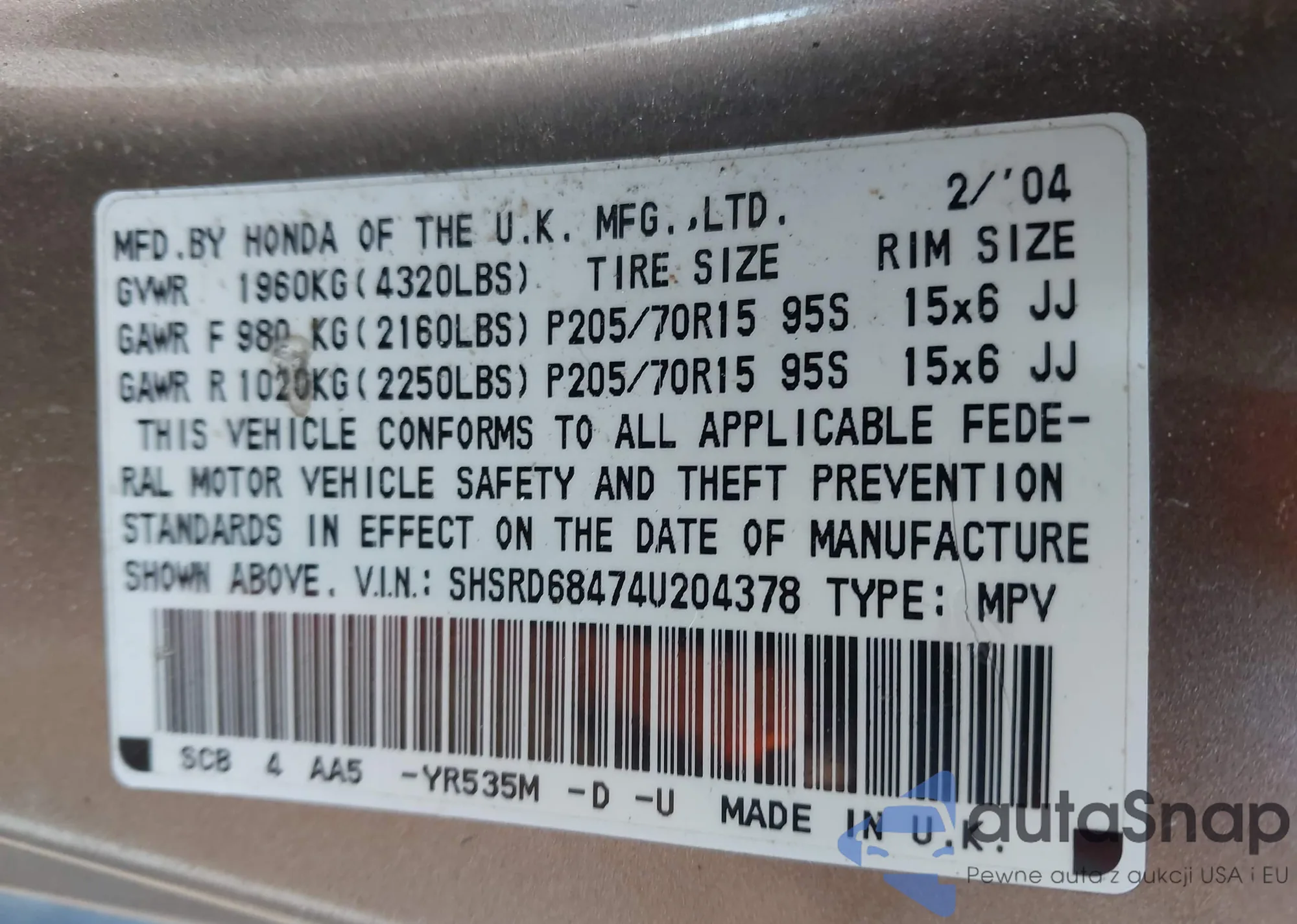 VIN: SHSRD68474U204378