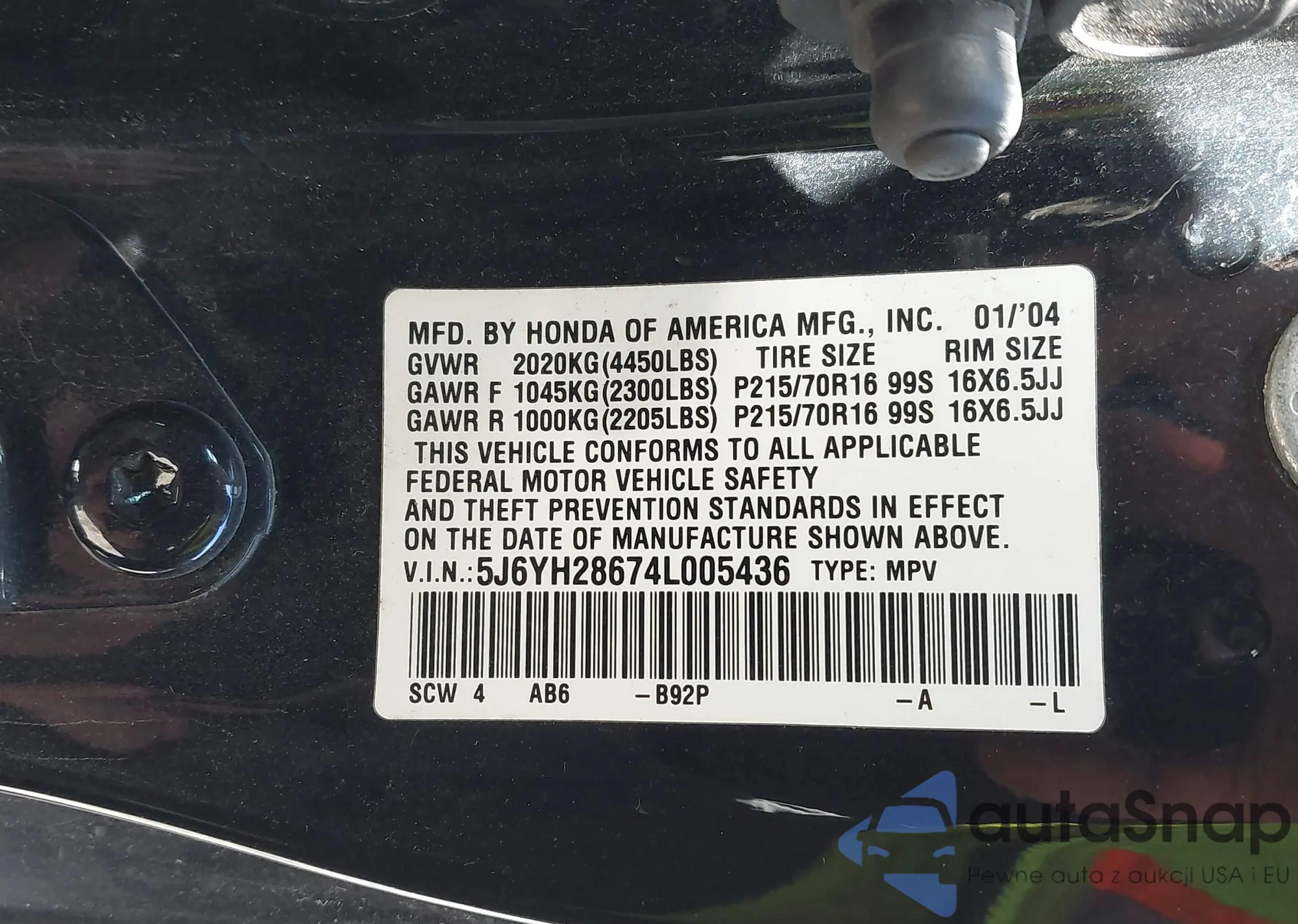 • VIN: 5J6YH28674L005436