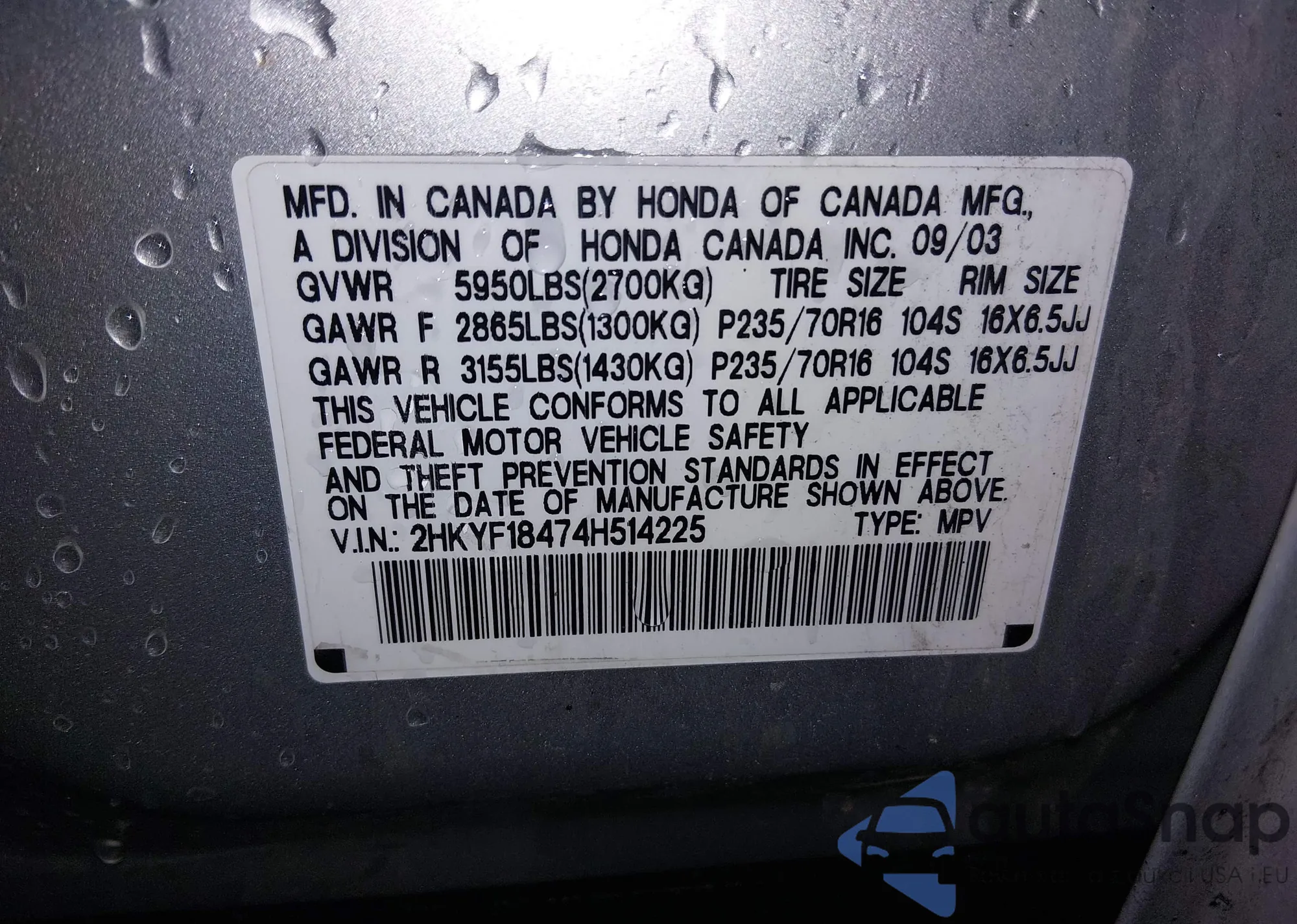 VIN: 2HKYF18474H514225