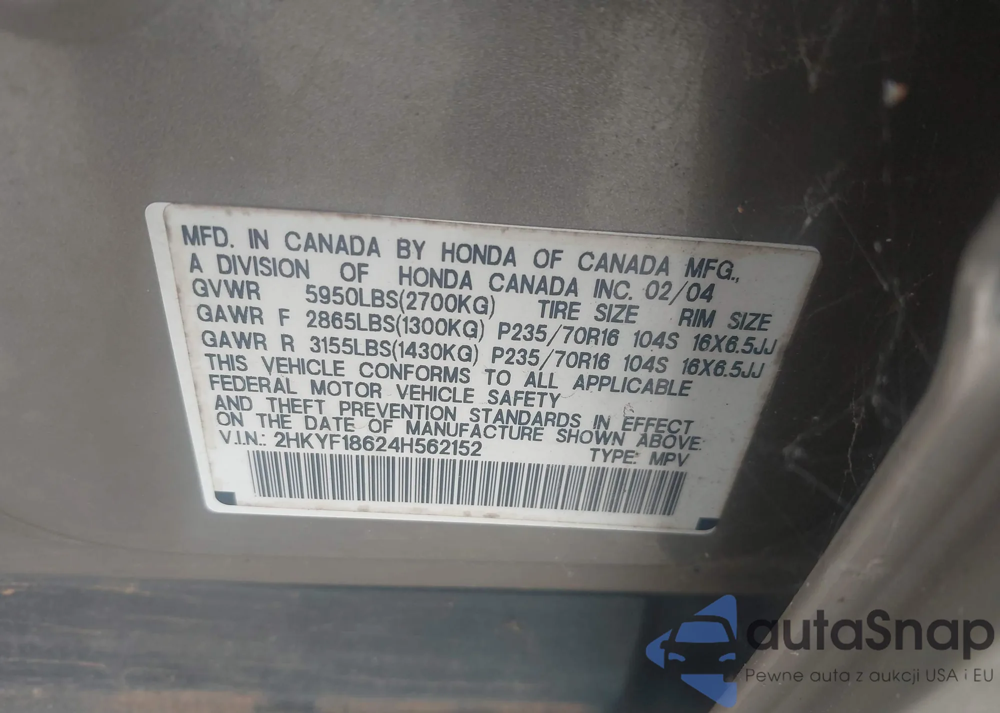 VIN: 2HKYF18624H562152