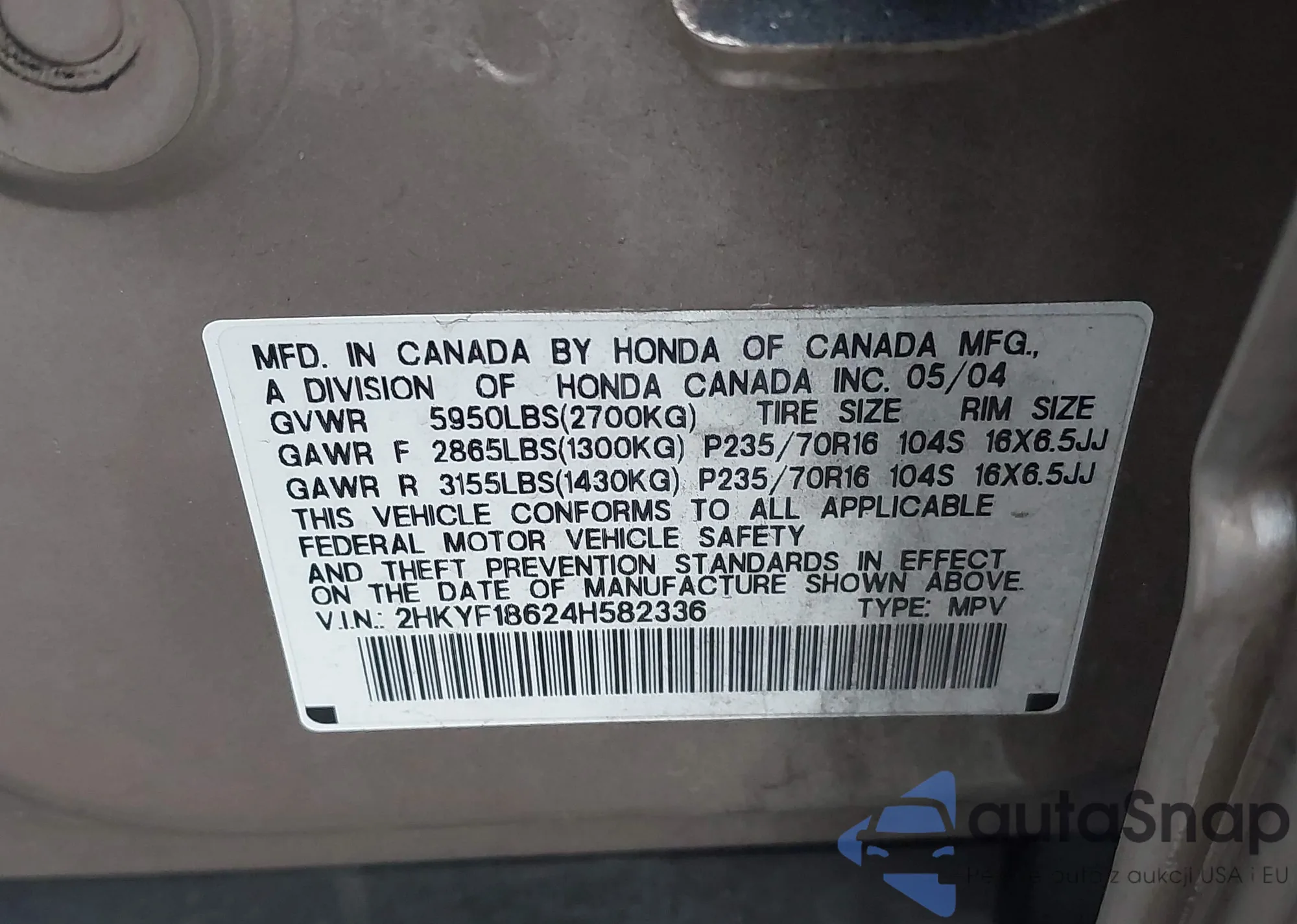 VIN: 2HKYF18624H582336
