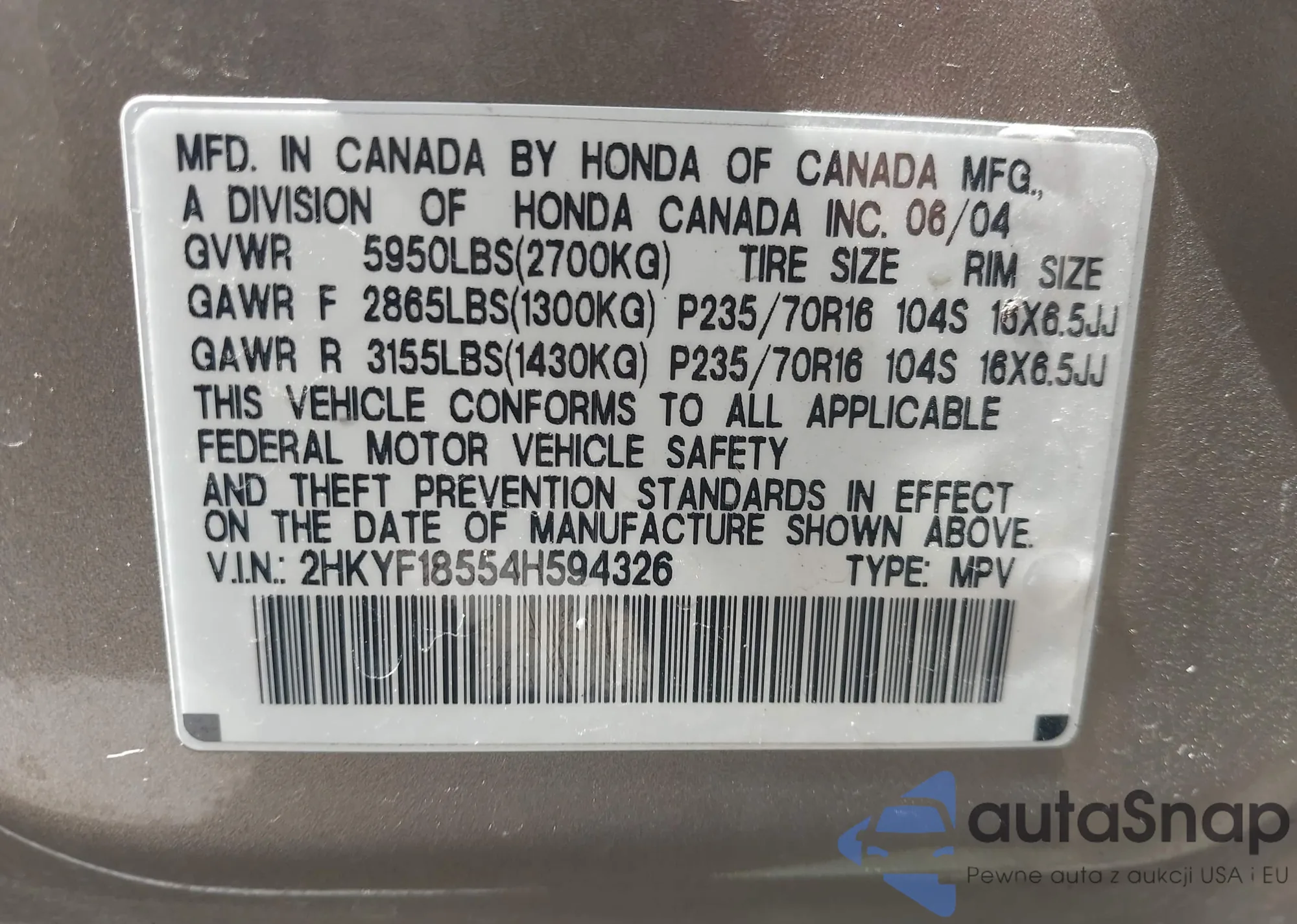VIN: 2HKYF18554H594326