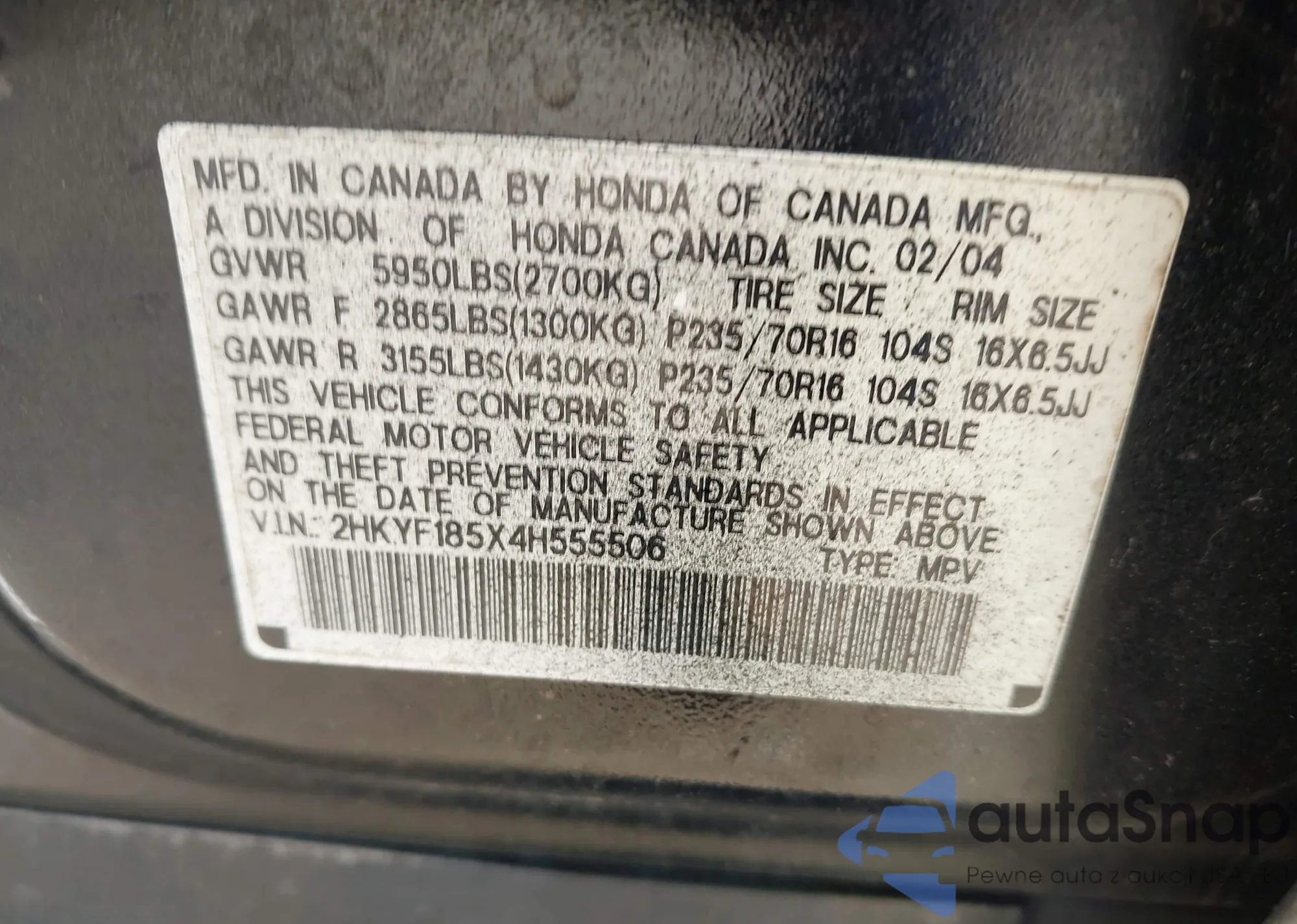 VIN: 2HKYF185X4H555506