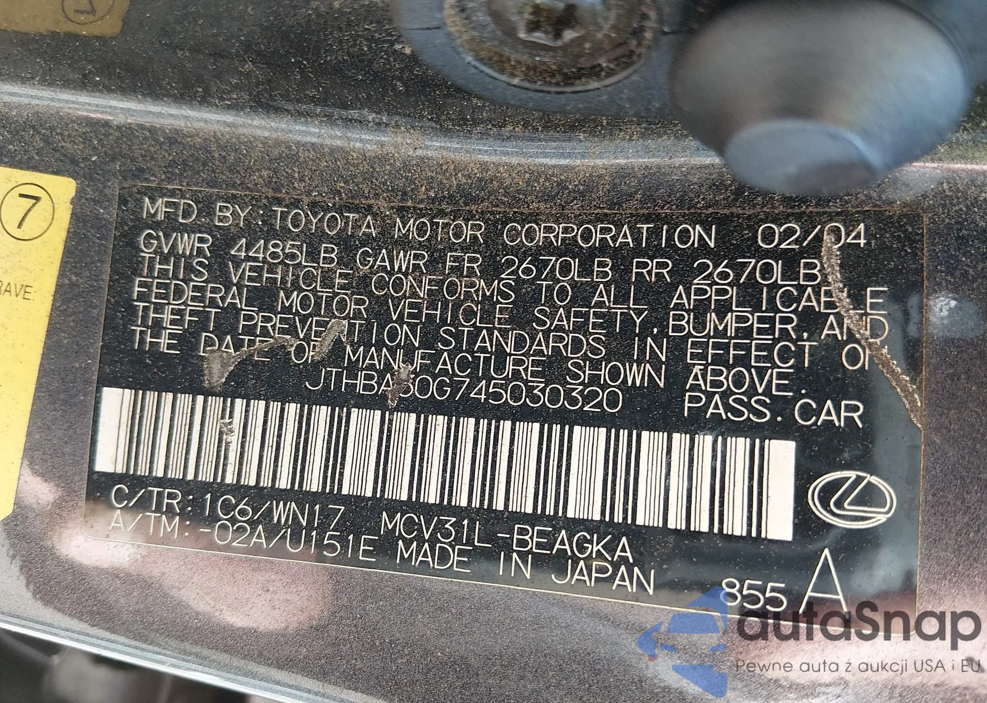 The car Lexus ES 2004 (VIN JTHBA30G745030320) is sold by an unverified seller. We recommend checking the Carfax report and confirming registration possibilities before purchase.