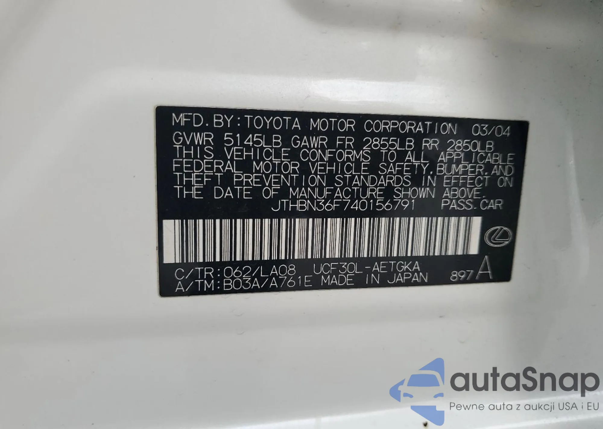 The car Lexus LS 2004 (VIN JTHBN36F740156791) has documents that prevent registration. Export and registration may be difficult. Contact AutaSnap experts to find alternatives.