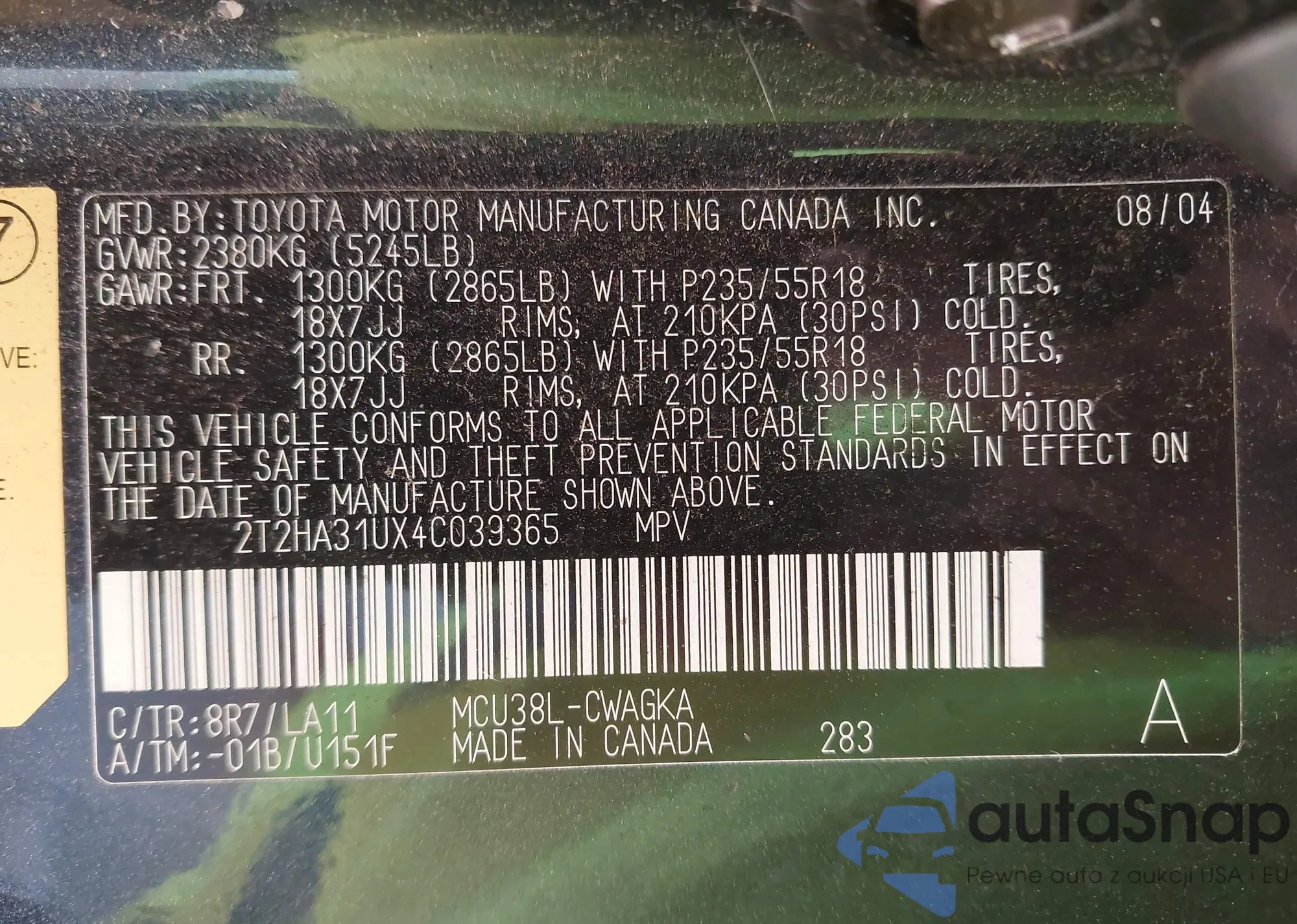 VIN: 2T2HA31UX4C039365