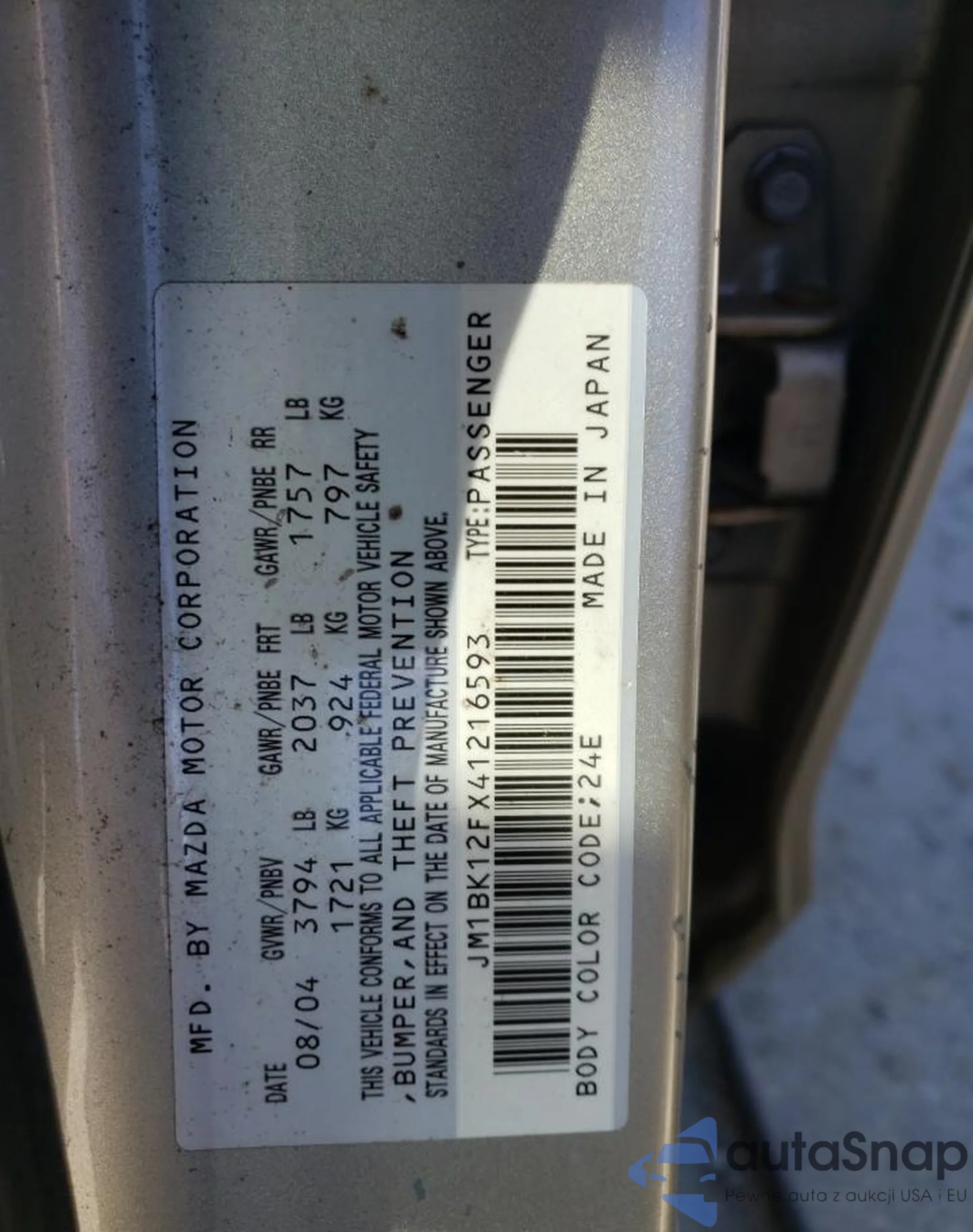 The car Mazda 3 2004 (VIN JM1BK12FX41216593) has documents that prevent registration. Export and registration may be difficult. Contact AutaSnap experts to find alternatives.