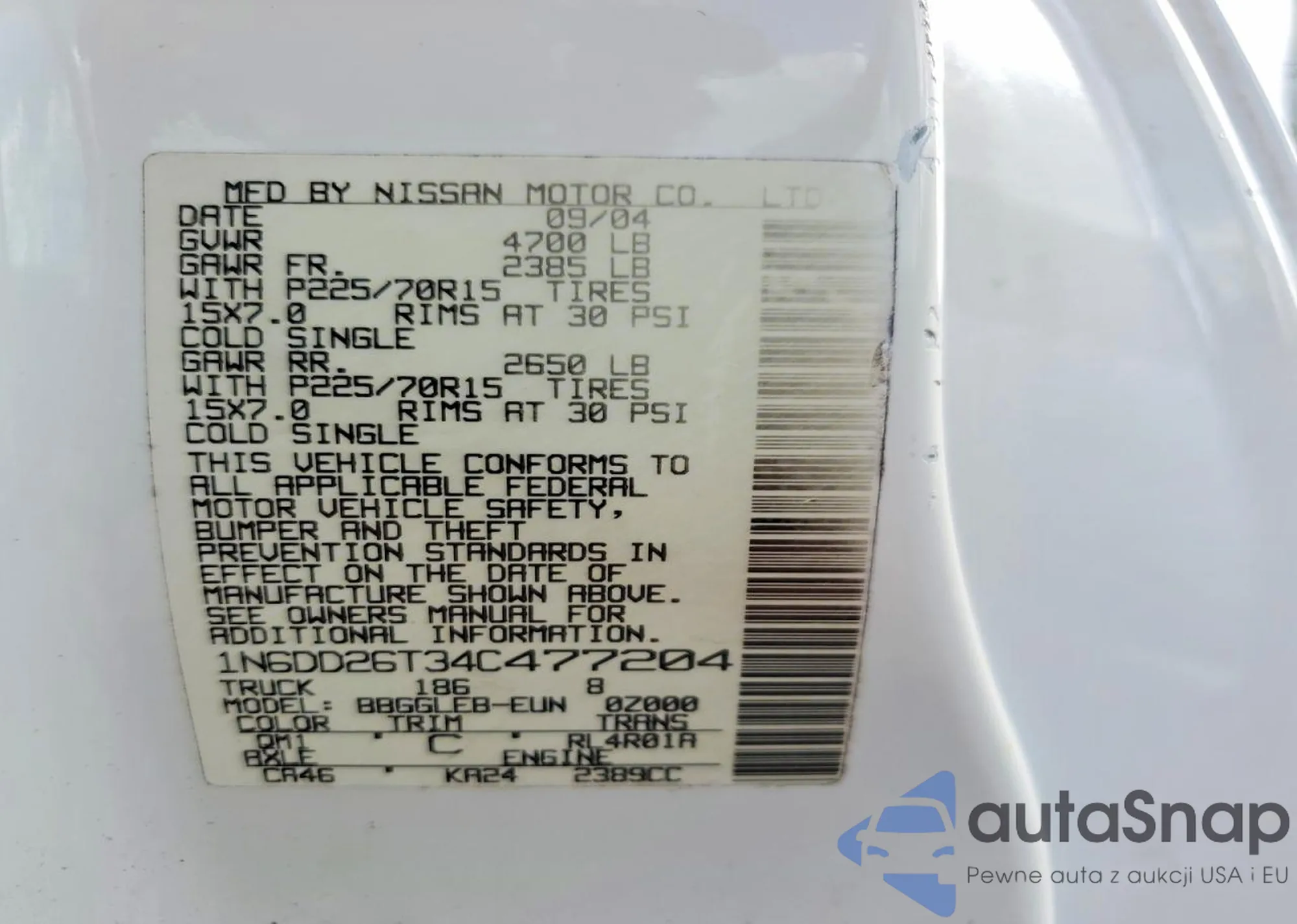 The car Nissan Navara (Frontier) 2004 (VIN 1N6DD26T34C477204) has not been auctioned before. The documents are clean, and the mileage matches or is below the market average. Sold by an insurance company – we recommend purchase. Delivery to the port will take approx. 6–8 weeks.