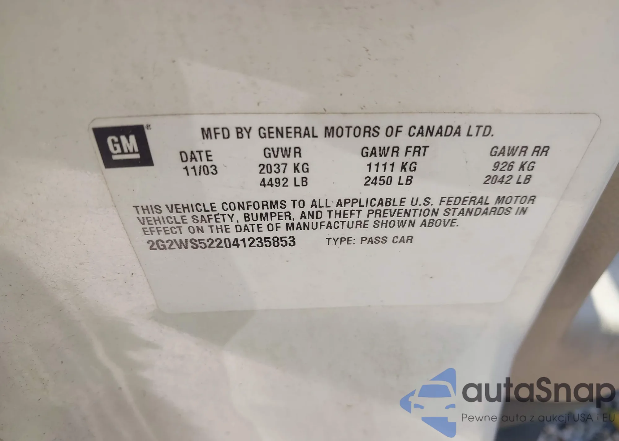 VIN: 2G2WS522041235853