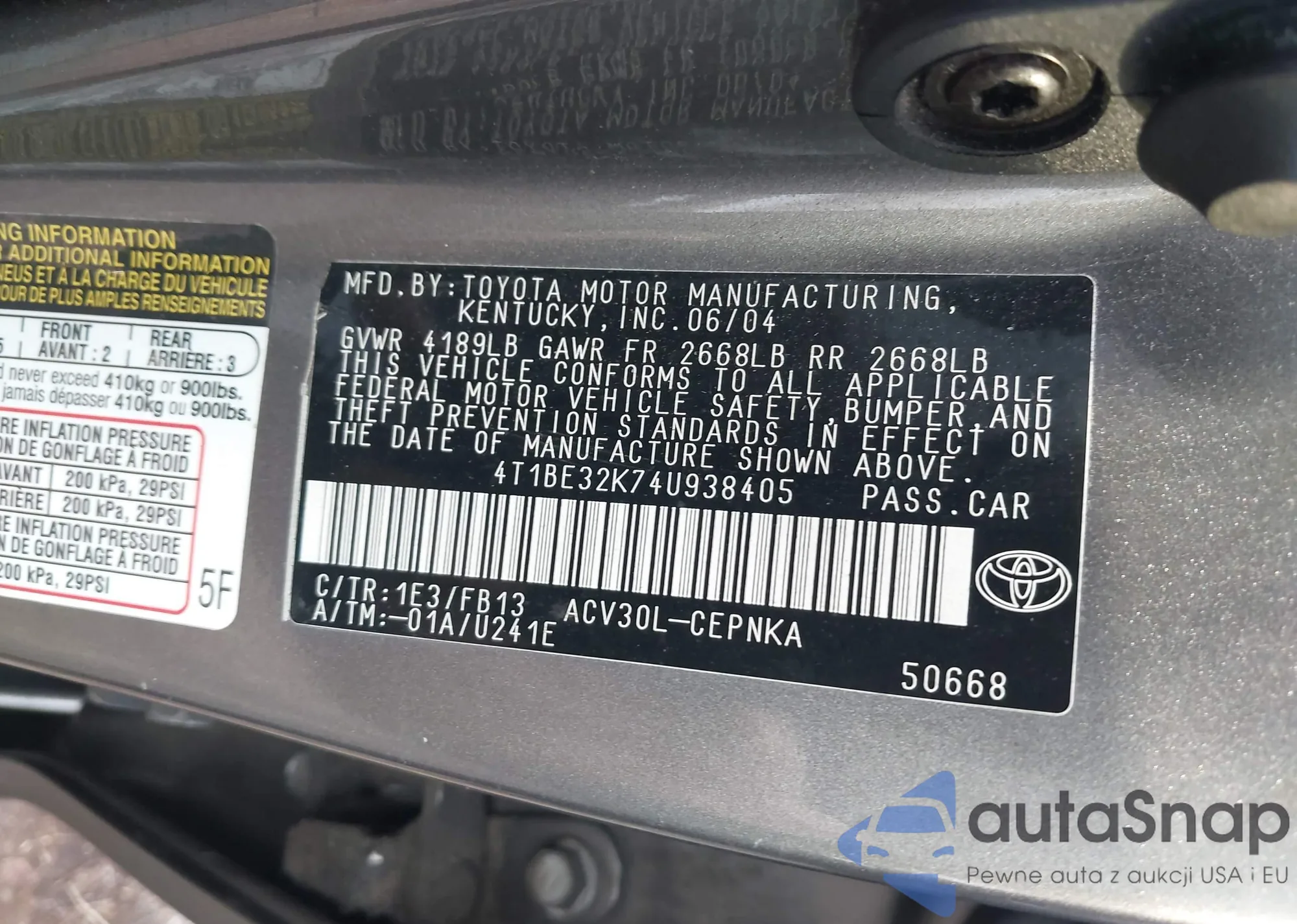 The car Toyota Camry 2004 (VIN 4T1BE32K74U938405) has not been auctioned before. The documents are clean, and the mileage matches or is below the market average. Sold by an insurance company – we recommend purchase. Delivery to the port will take approx. 6–8 weeks.