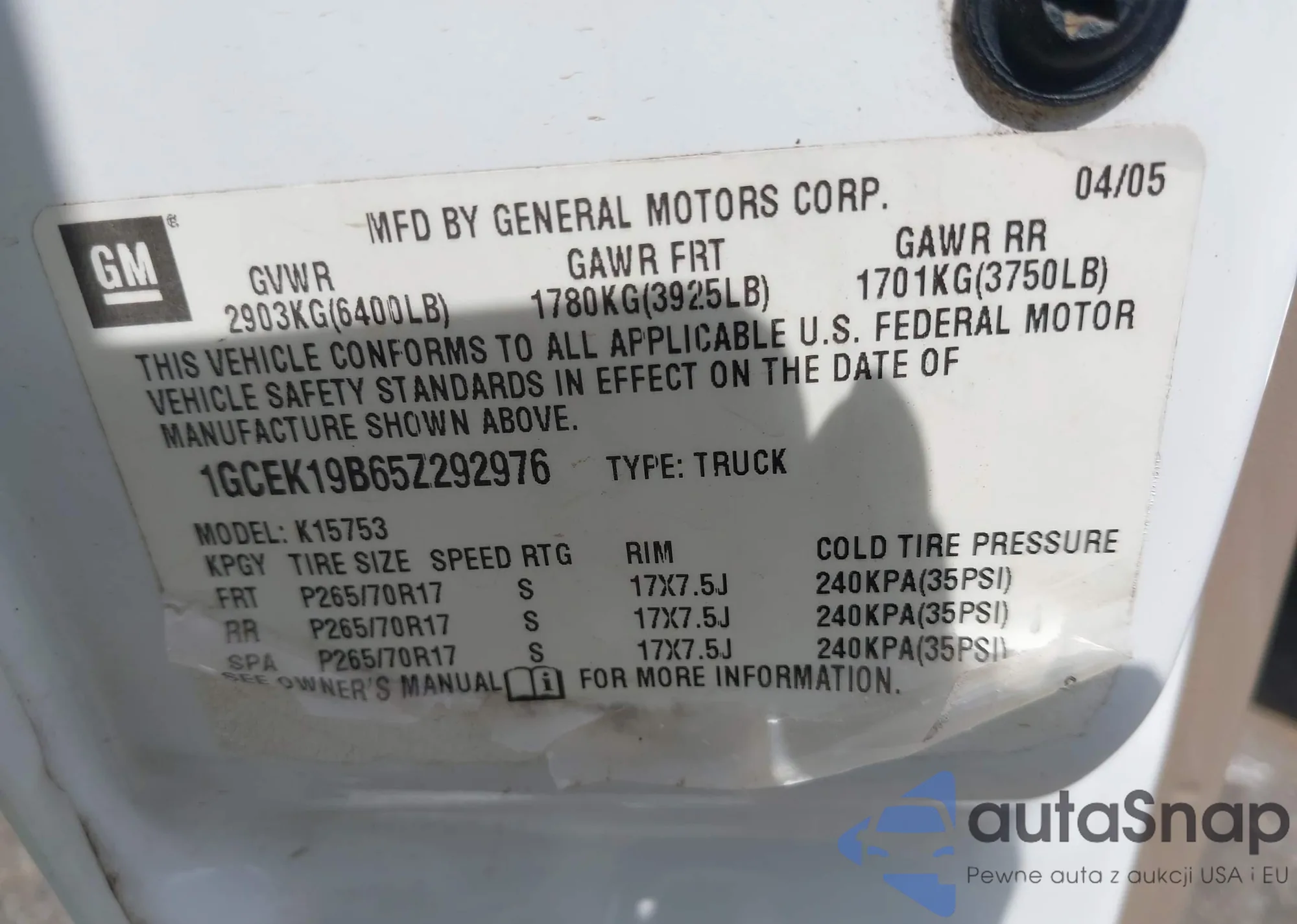 VIN: 1GCEK19B65Z292976