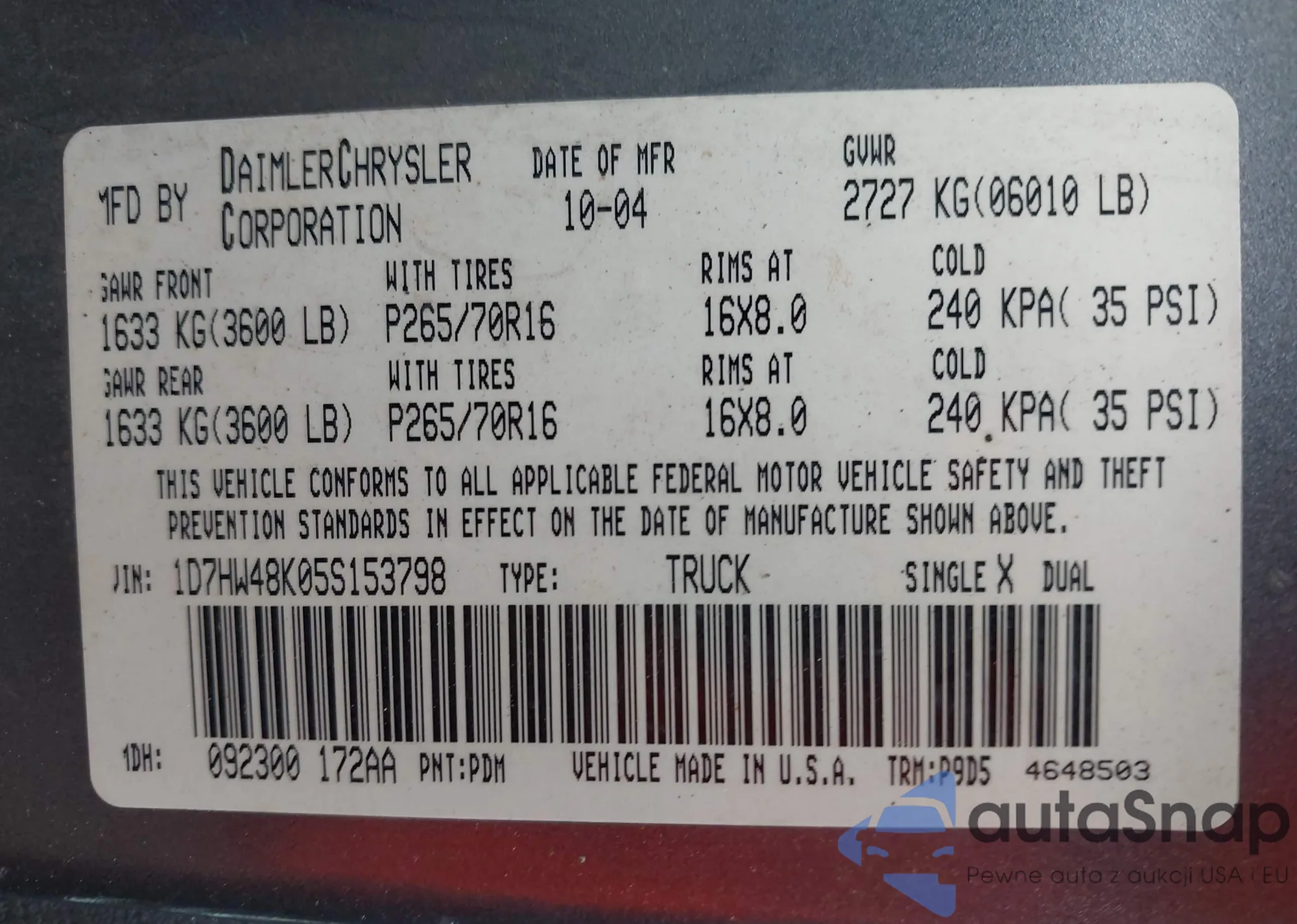 VIN: 1D7HW48K05S153798