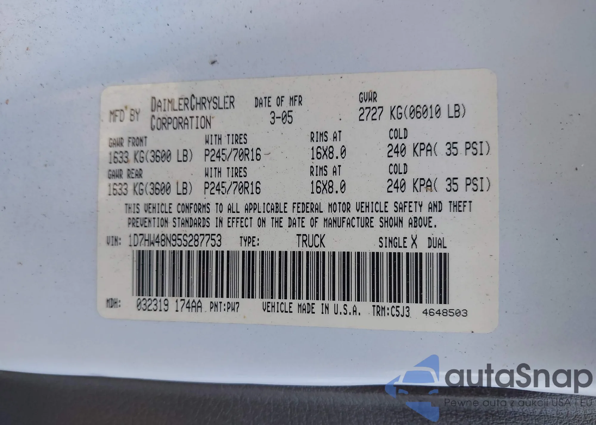 VIN: 1D7HW48N95S287753