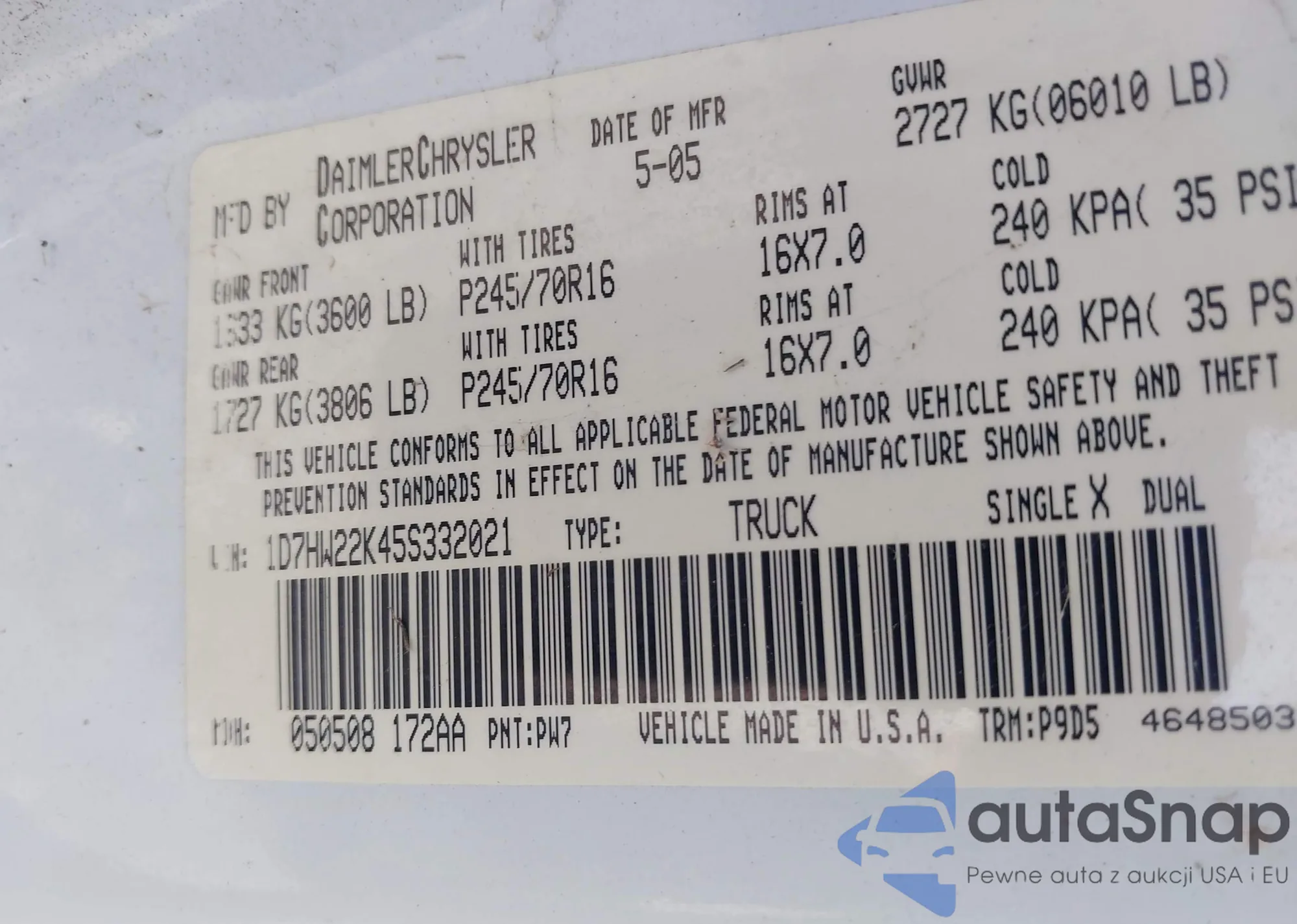 VIN: 1D7HW22K45S332021