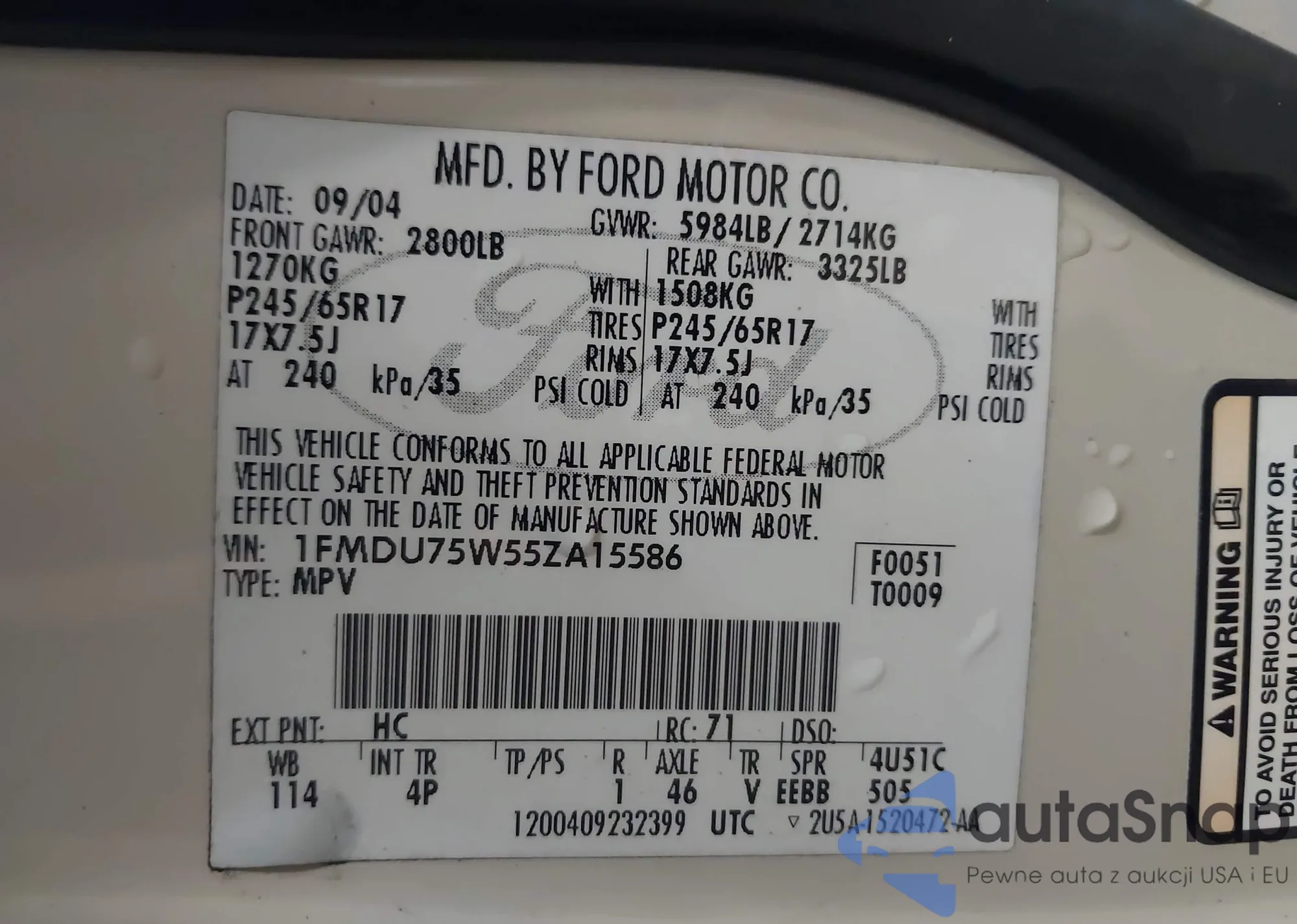 The car Ford Explorer 2005 (VIN 1FMDU75W55ZA15586) has not been auctioned before. The documents are clean, and the mileage matches or is below the market average. Sold by an insurance company – we recommend purchase. Delivery to the port will take approx. 6–8 weeks.