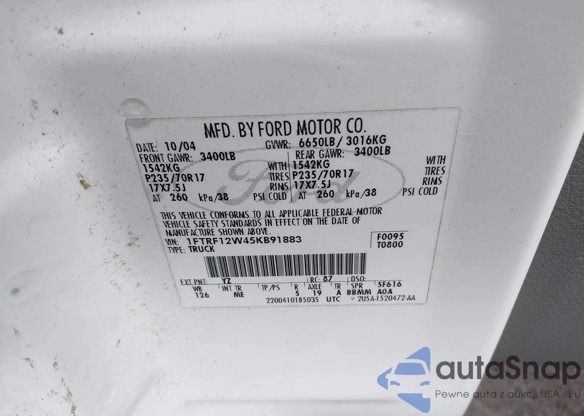 The car Ford F-150 2005 (VIN 1FTRF12W45KB91883) is sold by an unverified seller. We recommend checking the Carfax report and confirming registration possibilities before purchase.