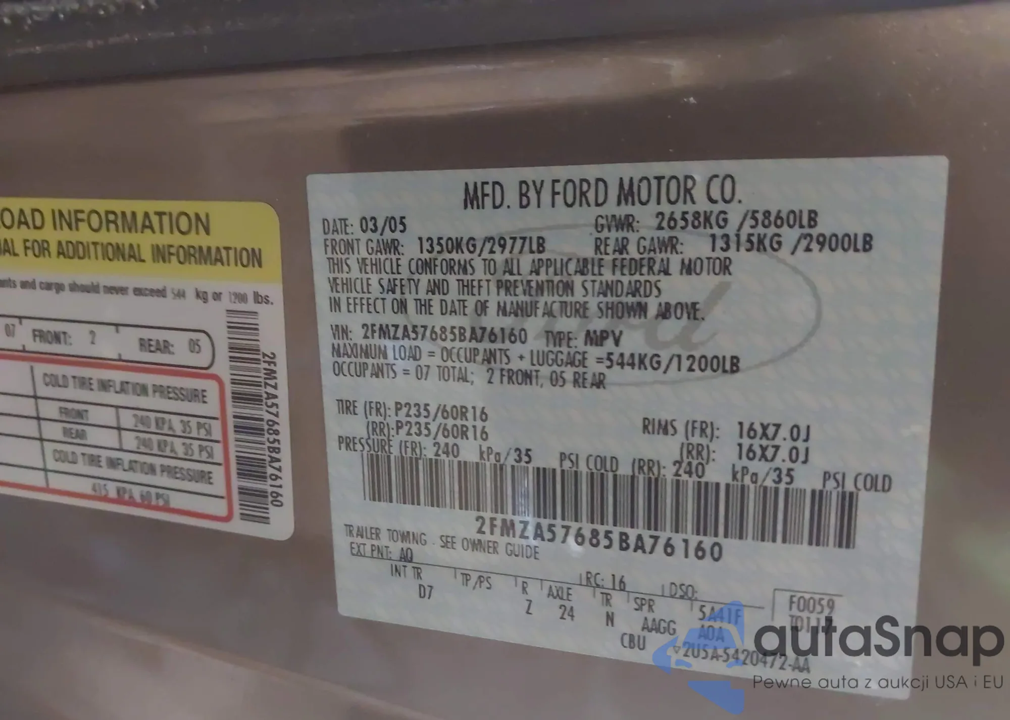 The car Ford Freestar 2005 (VIN 2FMZA57635BA76160) is sold by an unverified seller. We recommend checking the Carfax report and confirming registration possibilities before purchase.