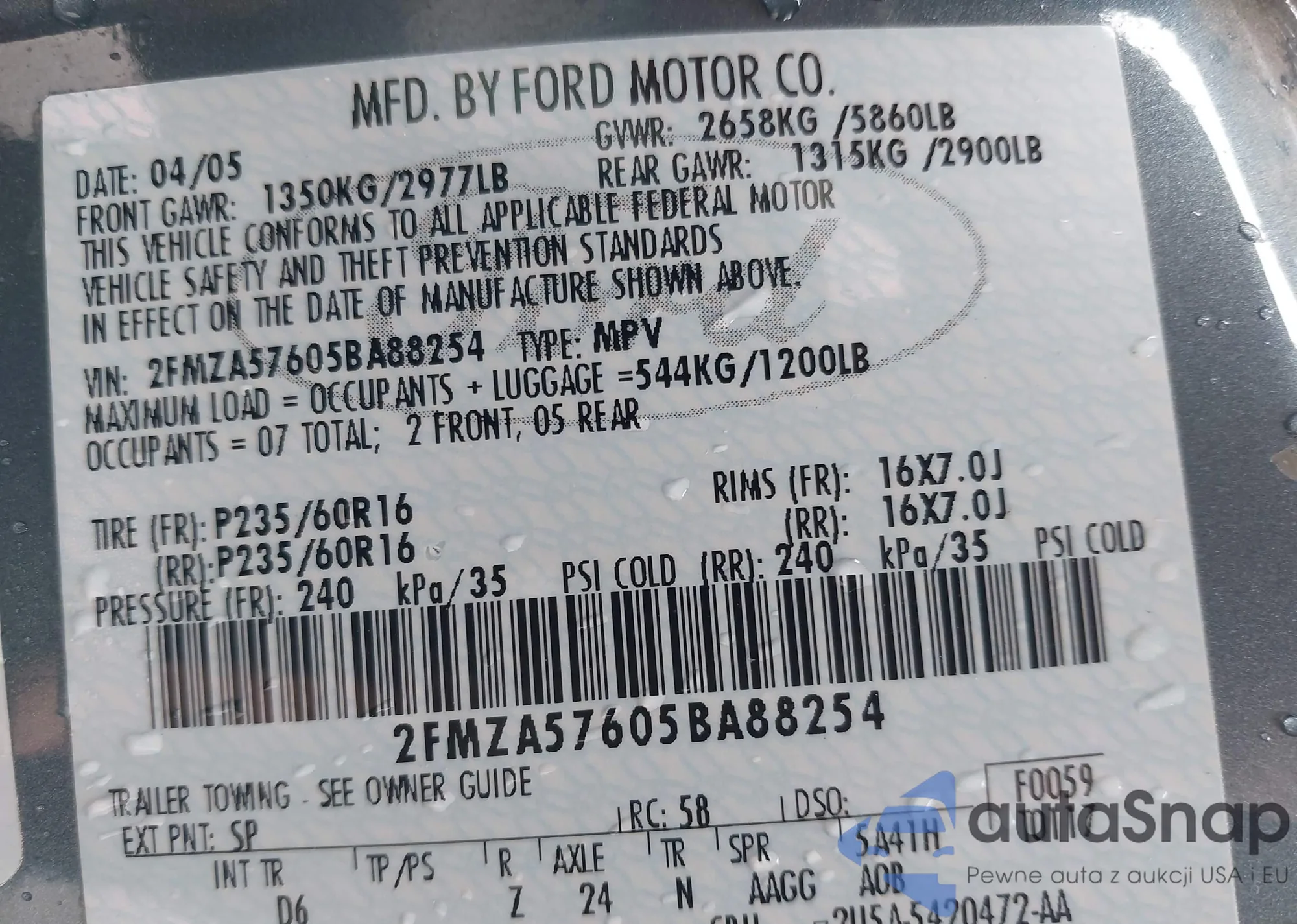 VIN: 2FMZA57605BA88254