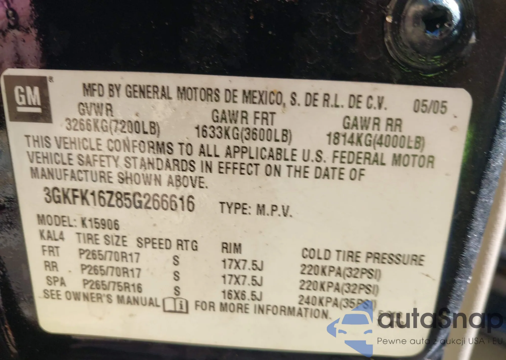 VIN: 3GKFK16Z85G266616